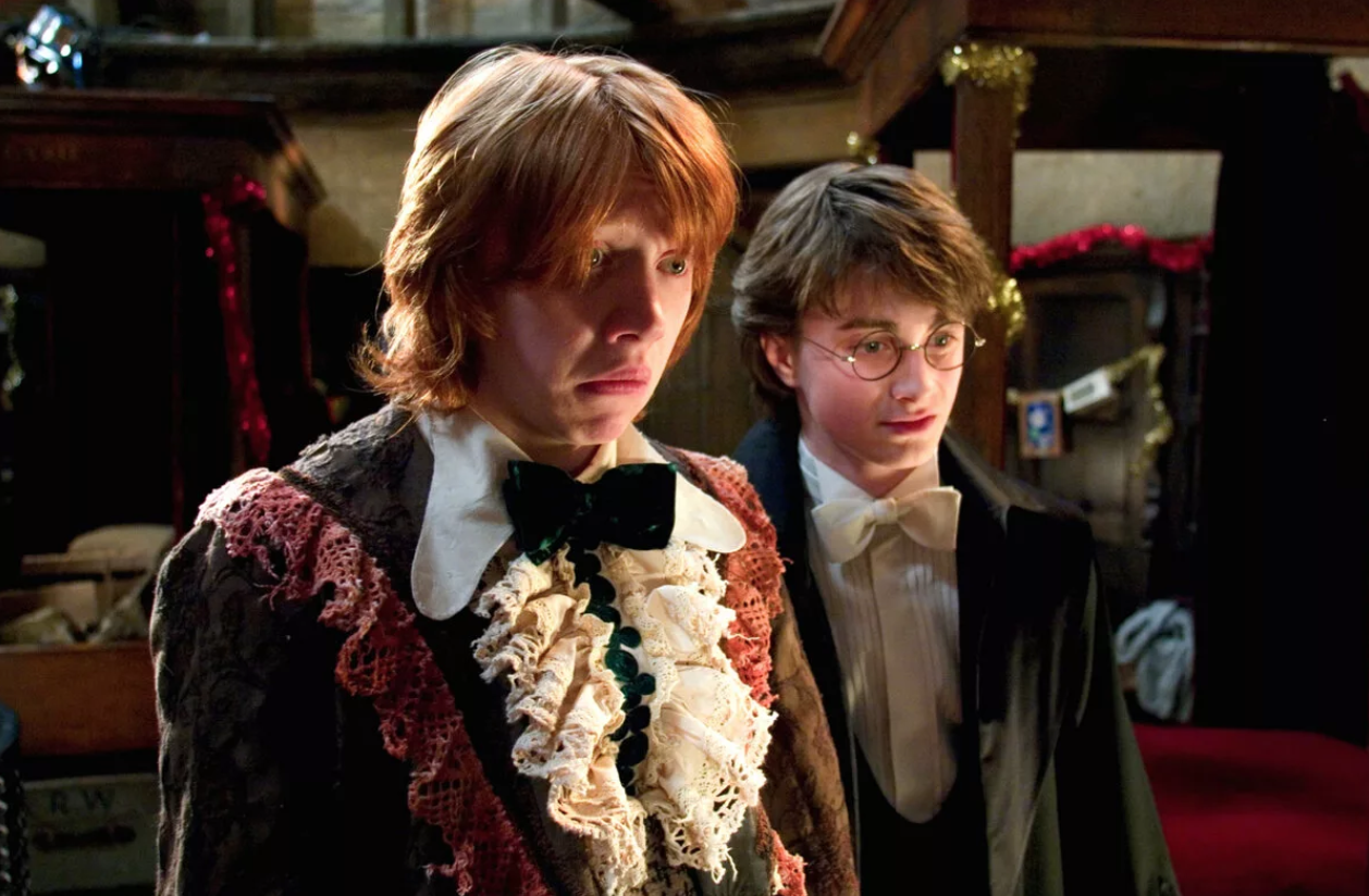 Курс четвёртый, и у нас тут – рождественский бал! На который Рон вынужден идти без нормальной парадной мантии, в чём-то архаичном, с кружевами, с запахом плесени – и над ним все смеются. Ну, потому что мама купила из того что было. Отцовскую же парадную мантию никак ни ушить, ни уменьшить нельзя, да и вообще, там же Джинни нужно снарядить и близнецов (потому что я что-то не вижу в тексте, чтобы у Джинни или близнецов были проблемы с нарядами). Та-а-ак, я уже начинаю понимать, почему Перси неистово мечтает сделать карьеру любыми усилиями, а два других старших брата свалили подальше от образцово-доброй-показательно-гриффиндорской семейки…