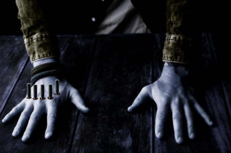 Запомнил лишь визуально именно тот момент по телику в детстве по ТВ3, по жанру, кажется, это либо триллер, либо ужасы. В фильме, помню был поздний вечер, то ли ночь. Парень с девушкой (или же он был один, сейчас трудно сказать), были в каком-то месте, напоминавшее заброшку или чей-то дом, и вот он обернулся к ней спиной и как-то так вышло, что он случайно напоролся на 4-5 прутьев или же болты и пробил себе руку. Он в ужасе поглядел на неё, и руку показали крупным планом, примерно как и по моим фото.