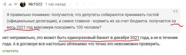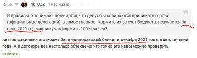 Я правильно понимаю: получается, что депутаты собираются принимать гостей (официальные делегации), а самое главное - кормить их за счет бюджета. получается за весь 2021 год максимум покормить 100 человек?