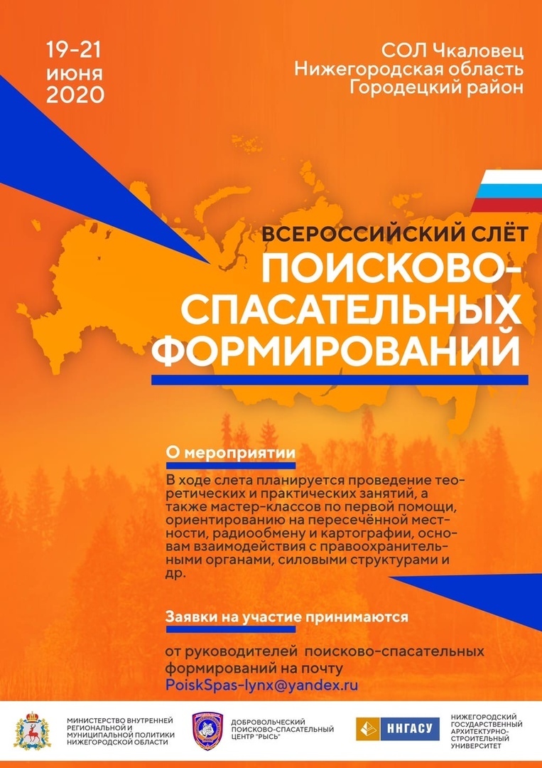 С 19 по 21 июня 2020 года в Нижегородской области впервые❗пройдёт Всероссийский слёт поисково-спасательных формирований, который организует Добровольческий поисково-спасательный центр РЫСЬ, при поддержке Министерства внутренней региональной и муниципальной политики Нижегородской области. Слёт пройдёт на территории СОЛ Чкаловец (Нижегородская область, Городецкий район).