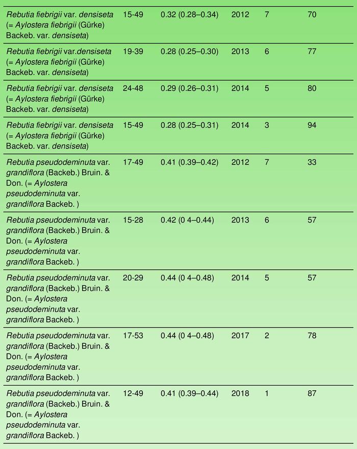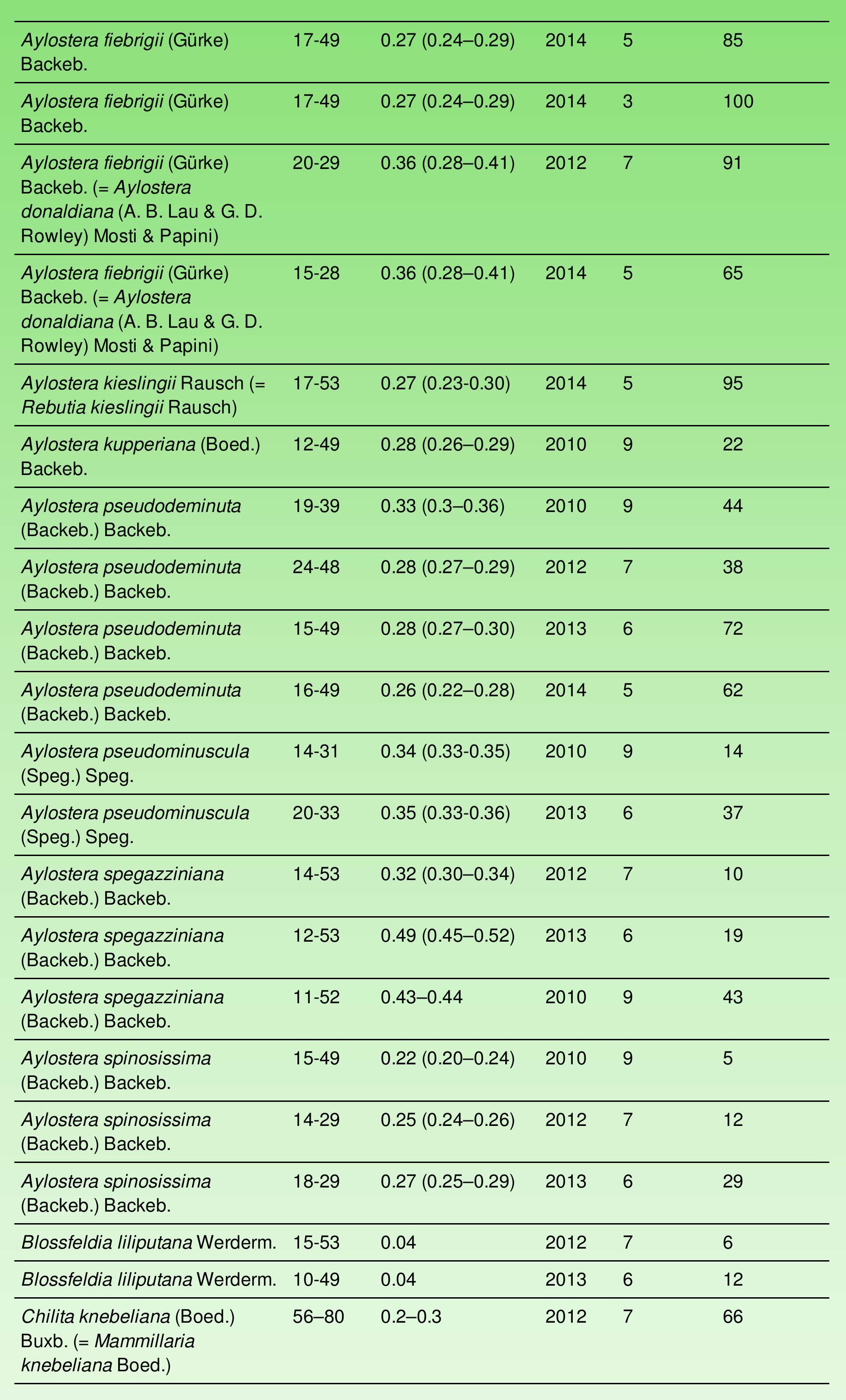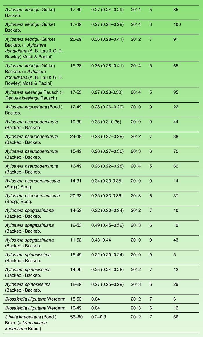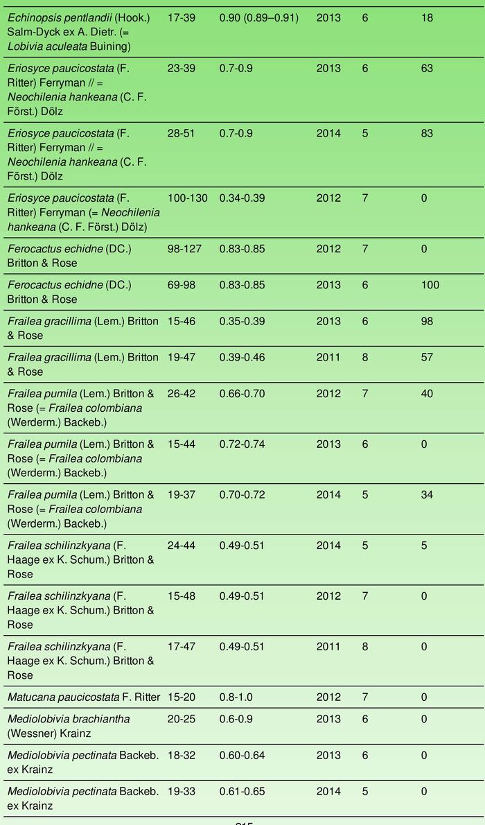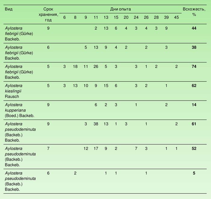 Из данных табл. 3 видно, что в разные годы качество семян одного вида различается. И при хранении в условиях лаборатории семена по-разному теряют всхожесть. Некоторые виды (например, Aylostera pseudodeminuta и Rebutia deminuta до 9-10 лет сохраняют всхожесть семян на высоком уровне. При этом образец семян Aylostera pseudodeminuta за 6 лет хранения потерял всхожесть до 5 %.