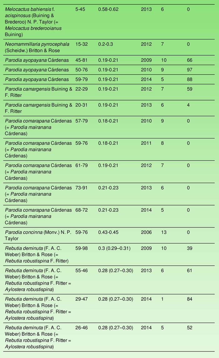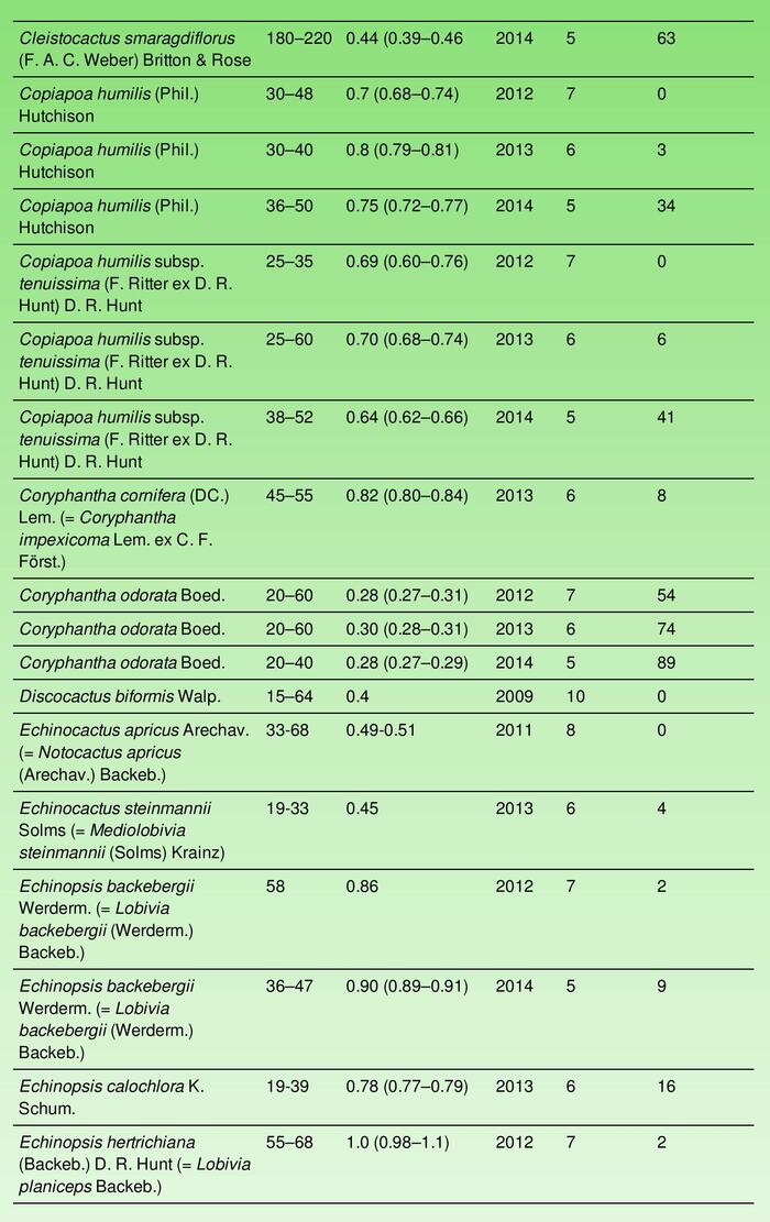 Таким образом, для издаваемых и рассылаемых «Перечней семян» (Index seminum, Delectus) можно использовать семена, хранимые в семенной лаборатории более 3-4, максимально до 5 лет. Однако хранить семена кактусов дольше 7 лет всё же не следует, хотя какие-то образцы семян могут быть и жизнеспособными. Длительно (до 10 лет) можно хранить семена лишь тех видов, которые не регулярно цветут и редко образуют семена.