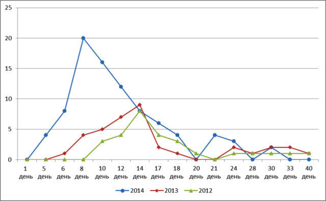 Рис. 1. Динамика прорастания семян Aylostera fiebrigii (Gürke) Backeb. разных лет урожая. По оси ординат – число проросших семян, по оси абсцисс – дни опыта.