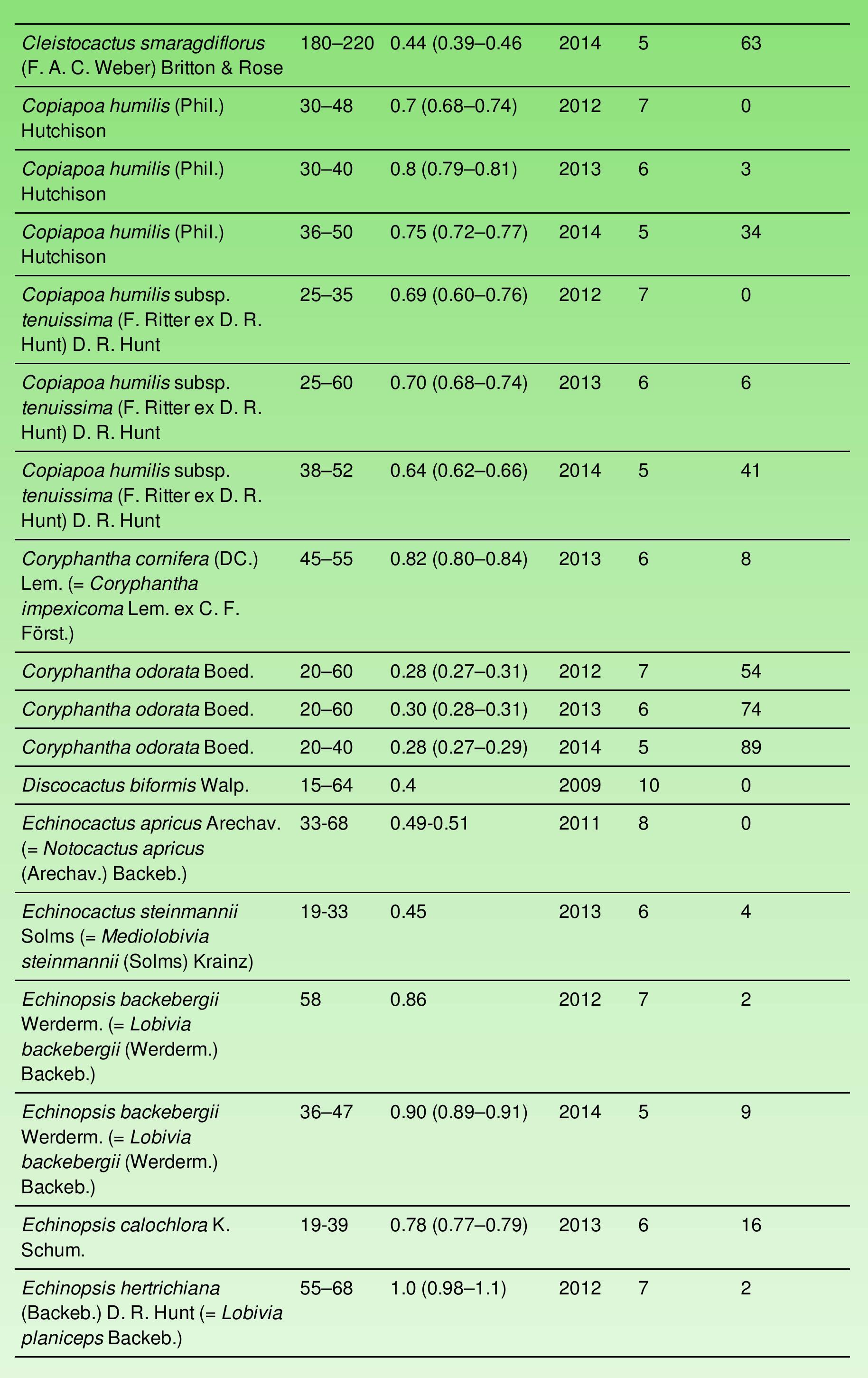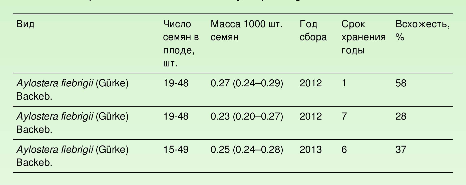 Данные для 80 образцов некоторых видов родов Aylostera, Blossfeldia, Chilita, Cleistocactus, Copiapoa, Coryphantha, Discocactus, Echinocactus, Echinopsis, Eriosyce, Ferocactus, Frailea, Matucana, Mediolobivia, Melocactus, Neochilenia, Neomammillaria, Parodia и Rebutia, полученные по числу семян в плоде, массе 1000 штук семян и их всхожести в зависимости от длительности хранения в условиях лаборатории, представлены в табл. 1.