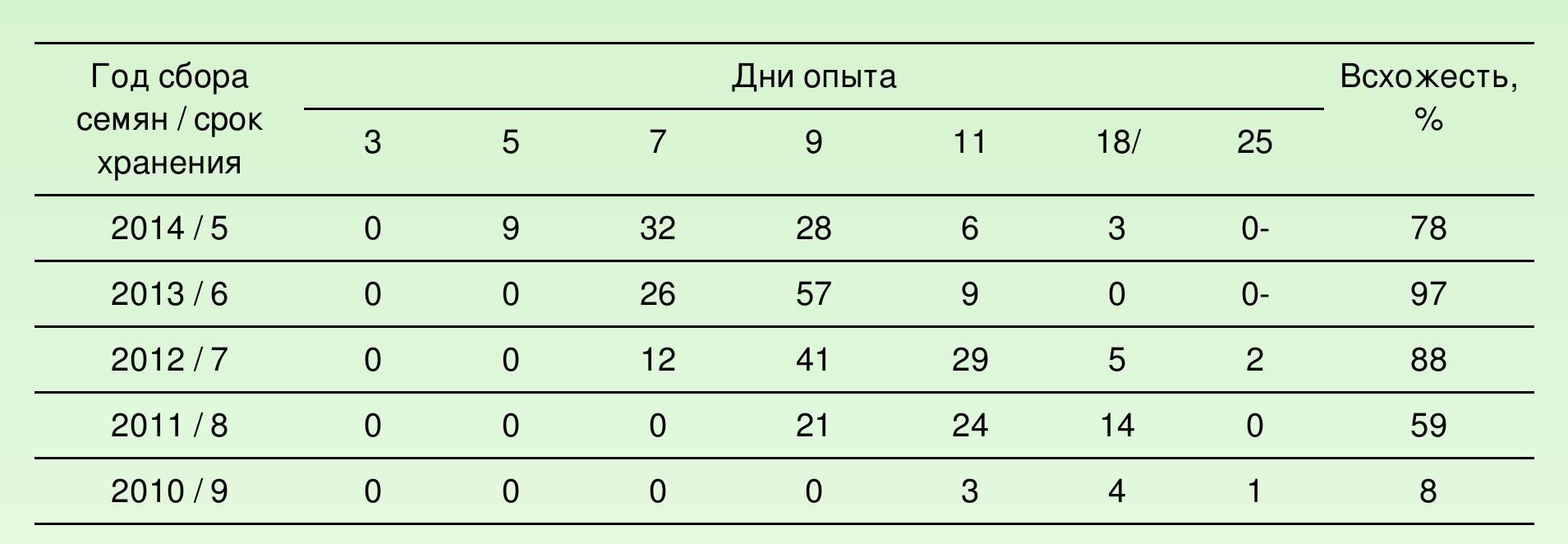 Из приведённых в табл. 1 данных видно, что в условиях оранжерей Ботанического сада Петра Великого в разные годы один и тот же вид образует разное, но близкое по значению, число семян в плоде, имеющих относительно разную массу 1000 шт. семян. Флуктуация результатов по годам во многом, по-видимому, объясняется числом солнечных дней и дневными температурами в период цветения, а так же агротехническими мероприятиями (частотой и составом подкормок, обработками растений от болезней и вредителей), которые доступны садоводам. В таблице прослеживается факт того, что с увеличением срока хранения семян в лабораторных условиях, всхожесть их у ряда видов некоторых родов снижается.