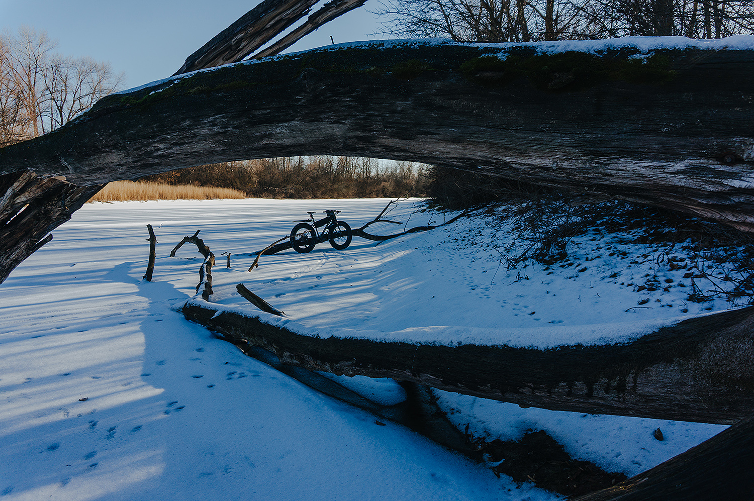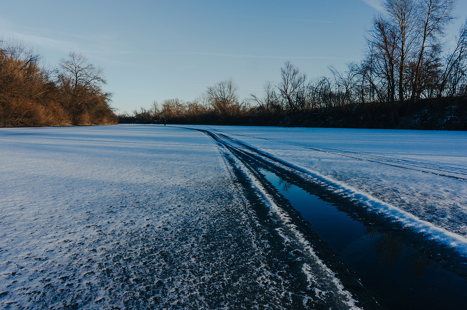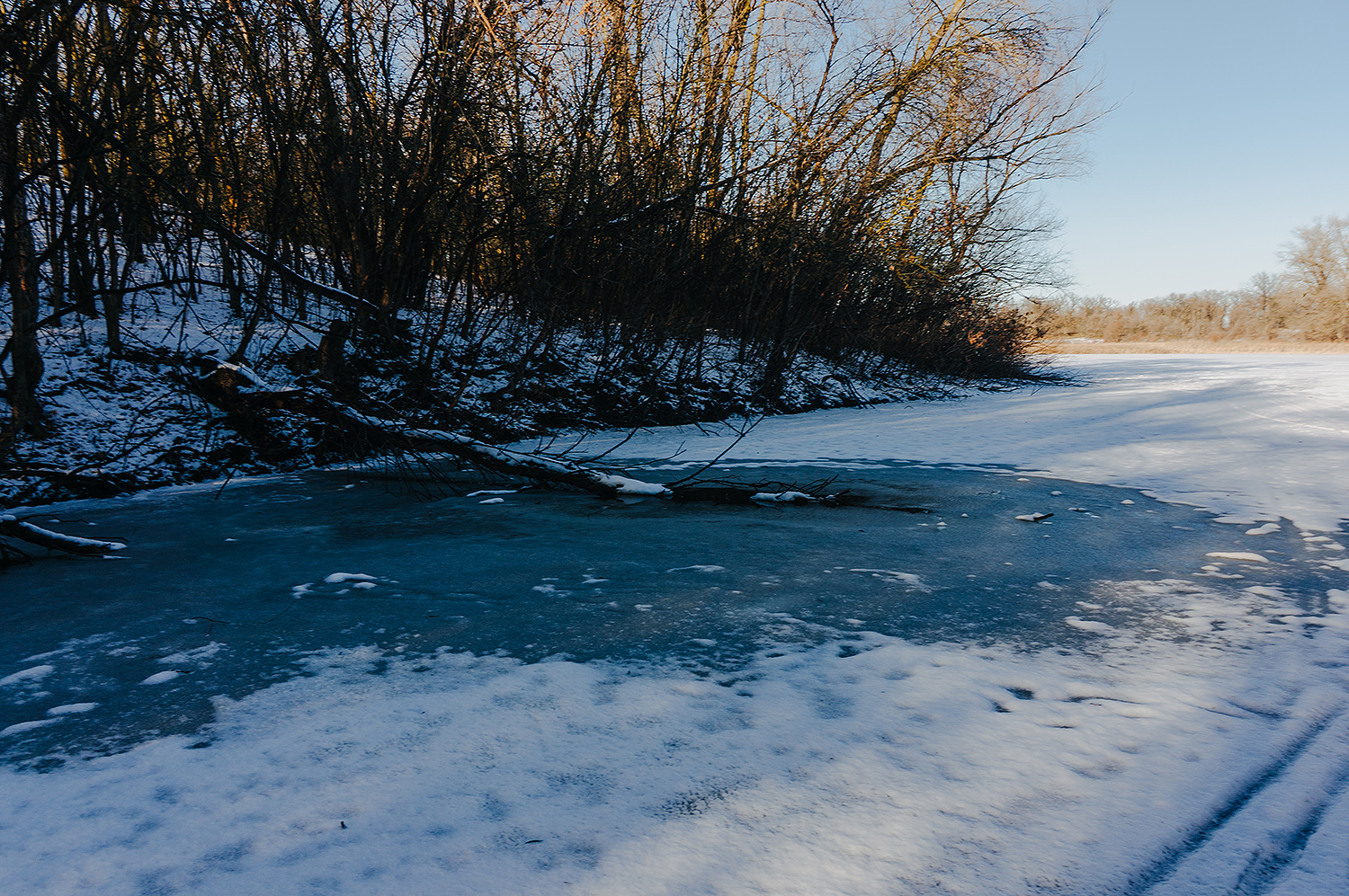 Время от времени, поперёк ерика попадались трещины льда, вокруг которых снег был пропитан водой, либо небольшие проталины возле берега. Иногда приходилось между ними лавировать в узких местах.