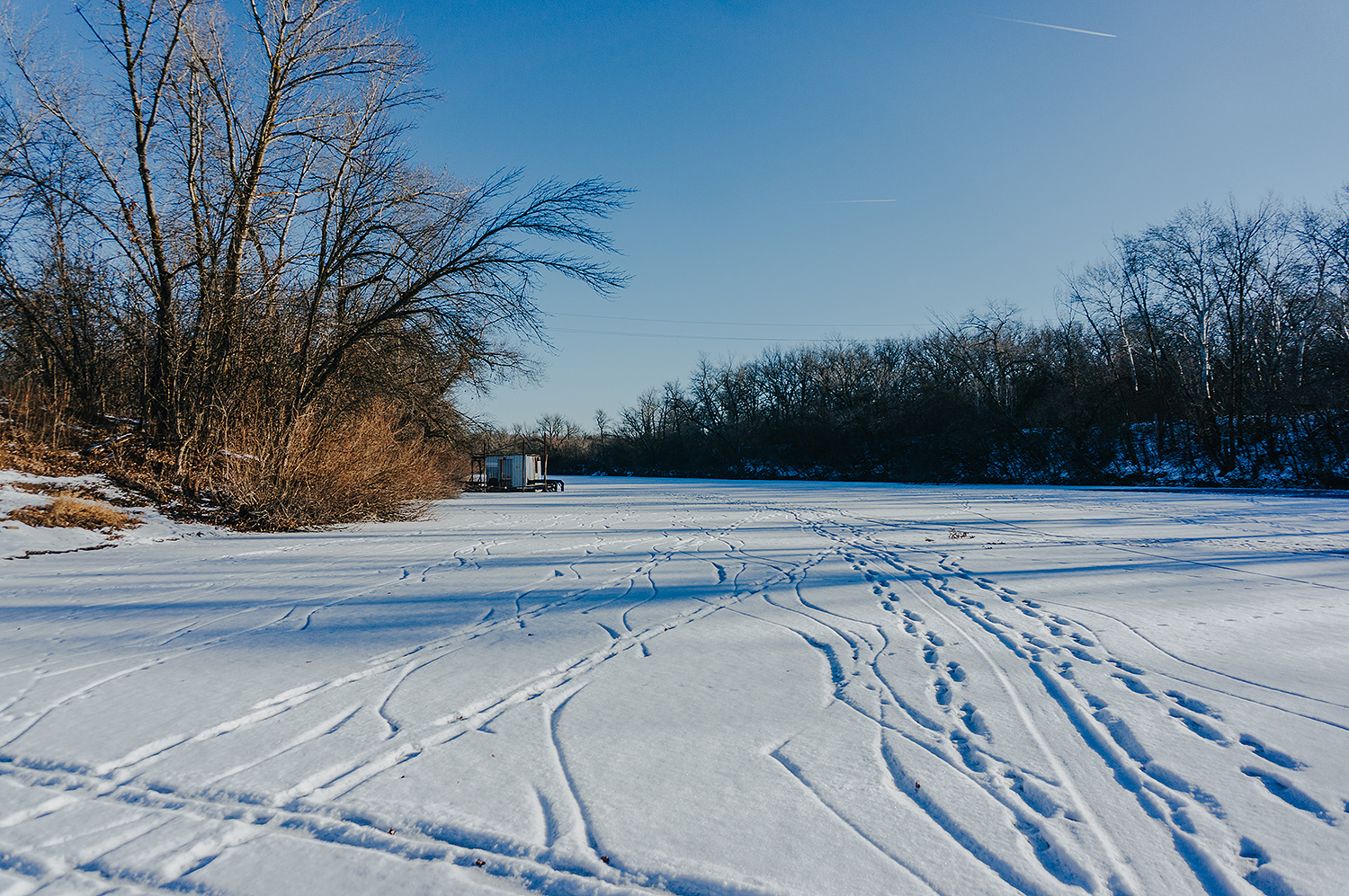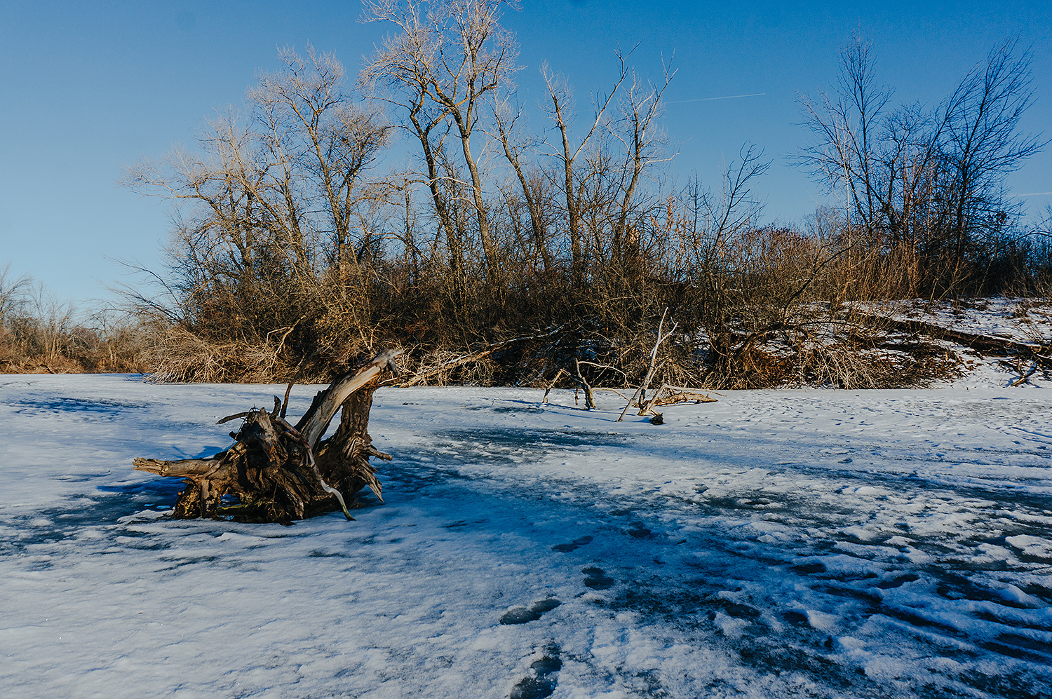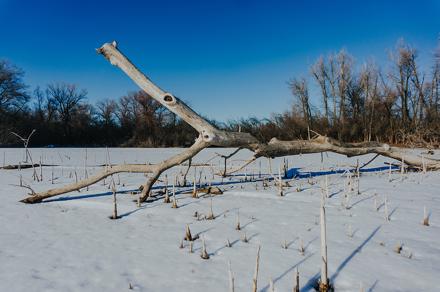 Время от времени, поперёк ерика попадались трещины льда, вокруг которых снег был пропитан водой, либо небольшие проталины возле берега. Иногда приходилось между ними лавировать в узких местах.
