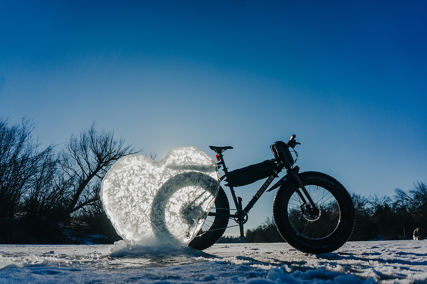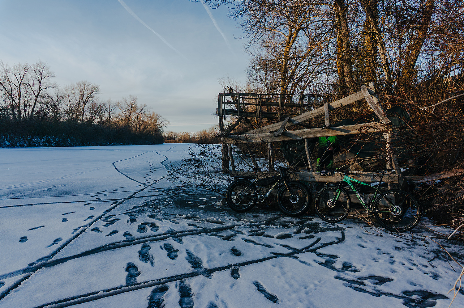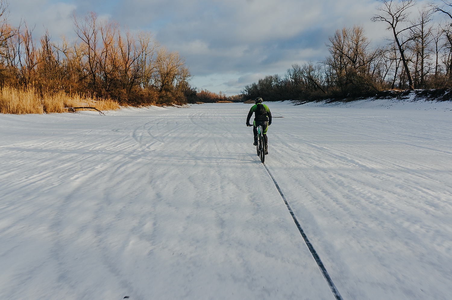 Разочек в процессе поменялись с товарищем велосипедами, чтобы хорошо прочувствовать разницу между фэтбайком и кантрийником на шипах в этих условиях.