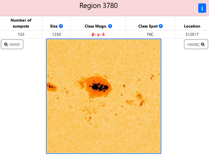 А ещё сейчас на Солнце видна группа пятен, которую можно увидеть невооруженным глазом. Вот это центральное пятно группы 3780 поистине огромно, оно в несколько раз больше нашей планеты. Но, не смотря на свои размеры, группа пока не проявляет особой активности. Но всё может измениться внезапно.