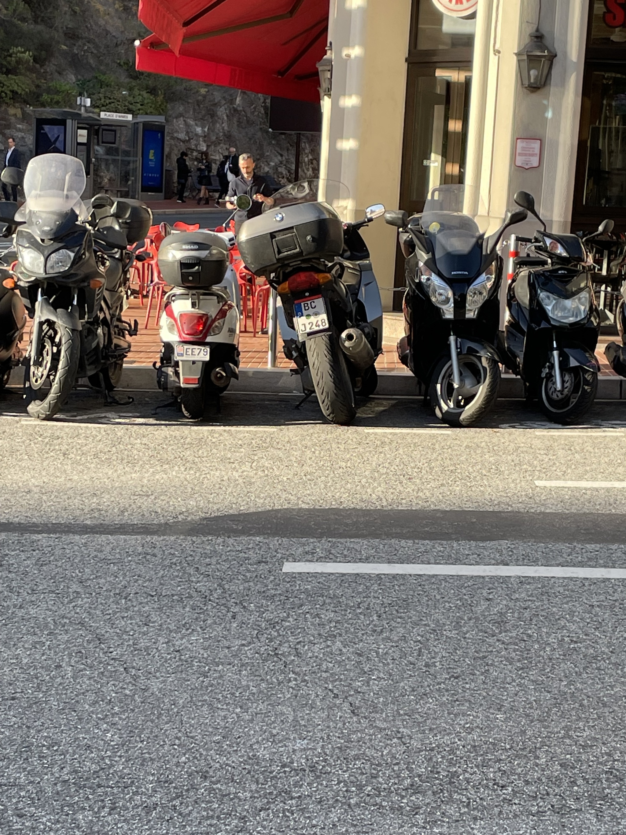 День 2. Гостиницу я, конечно же, забронировал без завтрака, поэтому утром пришлось заняться исследованием местности на предмет "чобысожрать". Был найден продуктовый магазин, а в нём, правильно, сэндвичи и энергетики. С коллегой договариваюсь словиться через 40 минут на оставленном ею адресе с комментарием "это недалеко". Парковка находилась метрах в 200 от гостиницы, надо было подогнать байк к подъезду (там улица шириной метра 3). И тут начались приключения. За раннее утро, пока я шарился в поисках магазина его замуровали (приехал-то я ночью - там пусто было и припарковался с немецким размахом). Если вы думаете, что основное средство передвижения в Монако - это спорткар, то вы глубоко ошибаетесь. Основное средство передвижения в Монако - это мопед... ну скутер... кубов на 125-250...