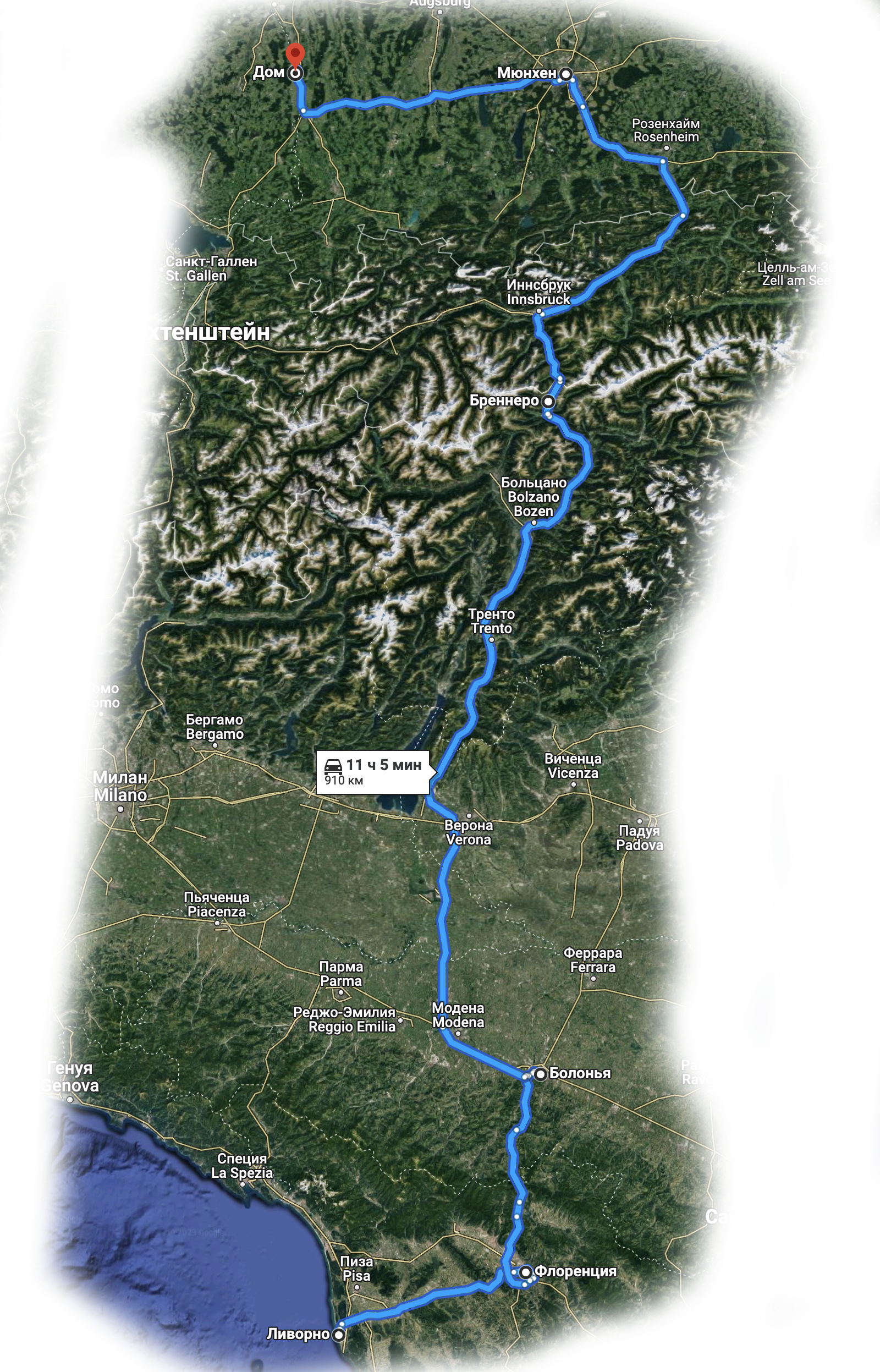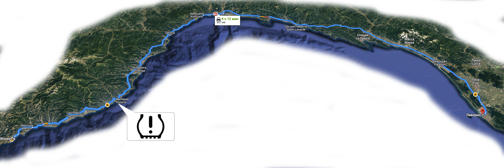 Минут через 20 приезжает-таки такси и говорит, мол, давай, садись... на итальянском, естественно. Недолго пытался объяснить водителю, что вообще нихера не понимаю, что происходит. Он также делает пару звонков и жестом просит успокоиться, мол, всё схвачено. И увозит меня в Империю - соседний городок. Высаживает возле шинного центра, берёт 37 евро и уезжает. А в шинном центре стоит мой байк. Непонятно, зачем была нужна эта схема с такси... толи таксист был фрателло с эвакуаторщиками и меня тупо развели на 37 евро, толи им действительно нельзя третьего в кабине возить и это был единственный выход. Одно я знаю точно - за перевозку байка до шиномонтажки они ни цента сверху не взяли. Один из сотрудников, который хоть как-то говорил по-английски, сказал, что они поменяли покрышку - была довольно крупная дыра, да и сточенная она уже, а парни с эвакуатора сказали, что мне надо в Ливорно - довольно далеко. Ну ОК... 130 евро вместе с работой. Недорого, на самом деле... правда пирелька, которую мне поставили, далеко не самая дорогая покрышка. Стоял-то мишлен за овер 200 евров (одно колесо). В общем... часа 4 я на этом деле потерял. Сан-Бартоломео-аль-Маре и Империю, наверное, запомню на всю жизнь. Пилим дальше. Датчик давления показывает по 2,5 очка в каждом колесе. Ну блин... они же должны знать, что в заднее надо 2,9 качать! В Италии мотоциклов полно и они эти покрышки каждый день меняют... Пох... нахожу ближайшую заправку и на ней подкачиваю до 2,9. Едем... А времячко уже вечернее.