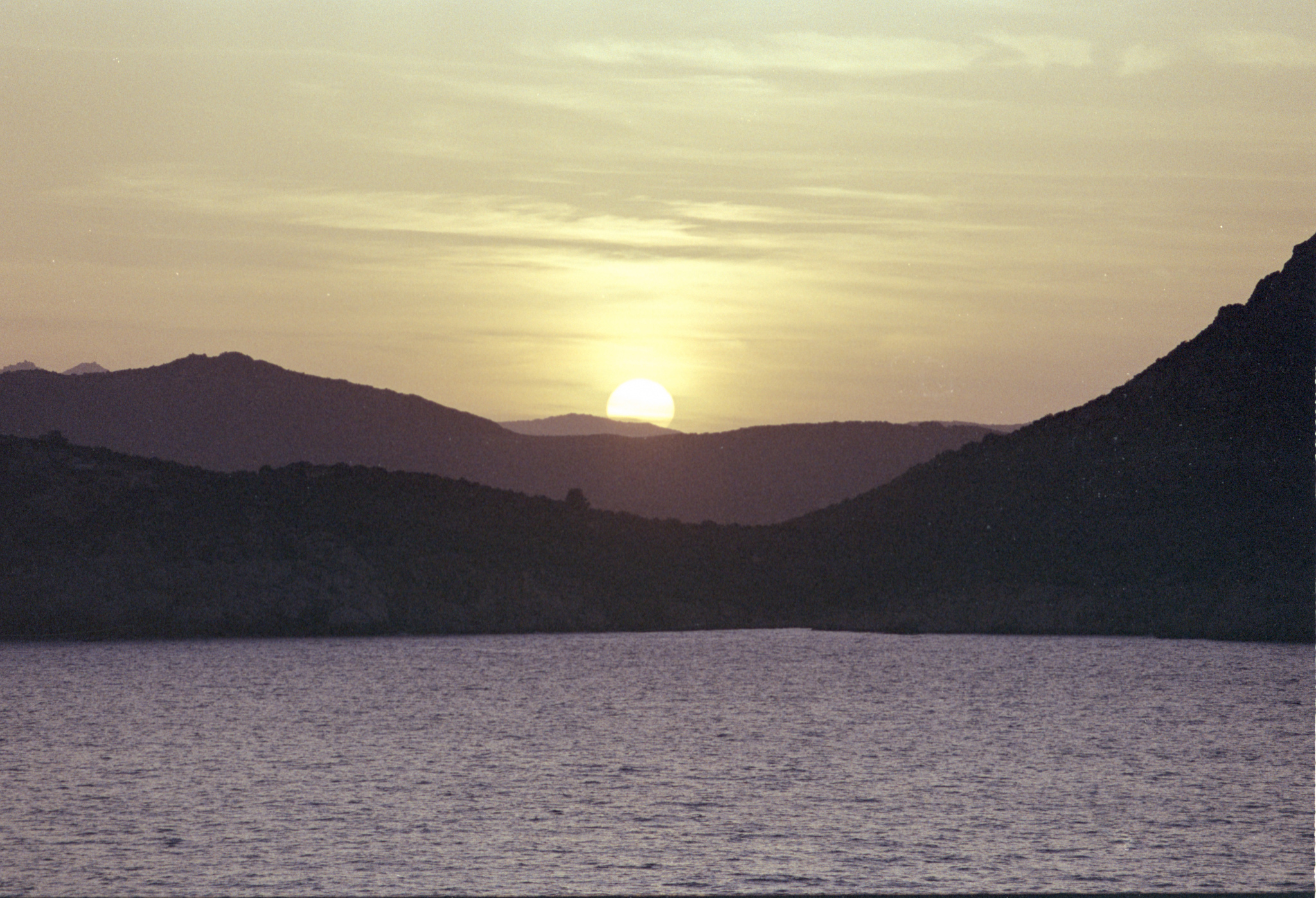 День 3. Утро... завтракаем. Не то, чтобы завтрак в гостинице был каким-то выдающимся, но он хотя бы был. Еду в порт в половине восьмого утра. Чтоб наверняка... Не зря... опять заблудился. В Ольбию паромы гоняет несколько компаний и у всех разные причалы. Ну, в итоге нашёл. Небольшой секьюрити чек и на лобаше красуется стикер Olbia. За два часа до отправления начинается погрузка. Машин немного. На мотоцикле я и вовсе один. Большая часть контингента - грузовики разных мастей. Оно и понятно. Плыть 9 часов и куда удобнее плыть ночью. Чувак на грузовой палубе сказал, что мы опаздываем с отправлением - долго разгружались, приходи в половине 12го, я при тебе мот привяжу. Ок... пока заселяемся в каюту, переодеваемся в гражданскую одежду и шаримся, изучаем всё вокруг. Контролируем, как привязали мотоцикл и идём в ресторан. Он как раз начал работать. Когда уже занимался хомяченьем, мы отплыли. Дальнейшее описывать особого смысла нет. Ну, разве что, я отправил в отель смску, что приеду позже, чем планировал. Мне в ответ написала Клаудия, которая просила довольно точно назвать время моего приезда. А это было задачей достаточно нетривиальной. Особенно в контексте текущего путешествия. К чести паромщиков а)обед был офигительский. Чисто итальяно. б) опоздание почти нагнали и выгрузились мы всего на полчаса позже от расчётного. А ещё на подходе к порту Ольбии я застал закат.