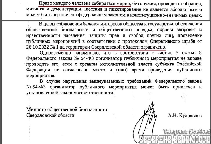 МОБ мотивировало отказ тем, что «право каждого человека собираться мирно может быть ограничено в конституционно-значимых целях», и сослалось на решение оперштаба от 26 октября 2022 года.