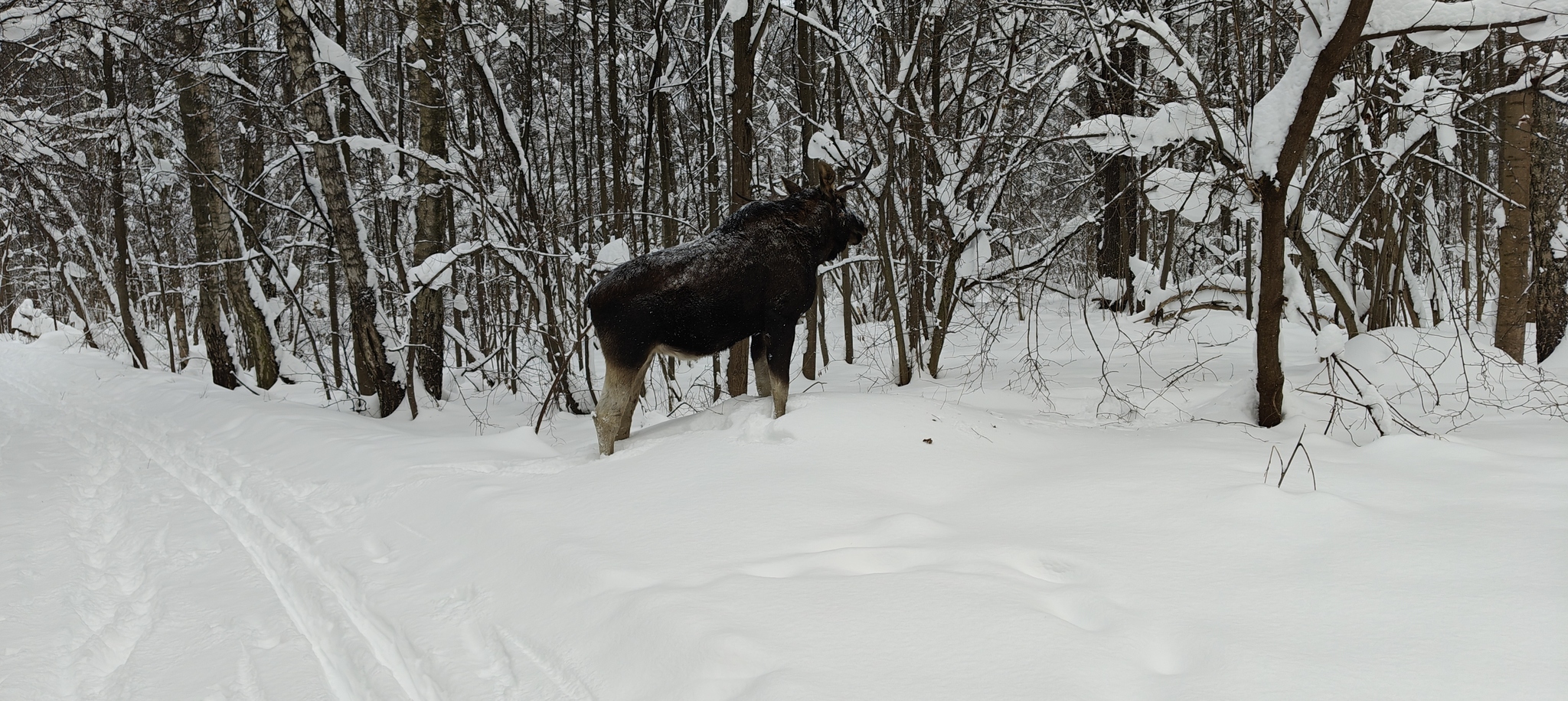 лыжник шел впереди, а лось, игриво виляя жопой, его догонял