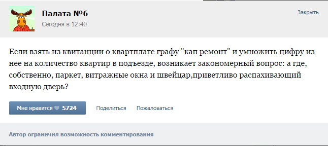 2 harut77777 встретил сегодня очень наивный пост 11 лет назад Всё перечисленное было добросовестно куплено, не верите? зайдите в гости домой к управляющему! ЖКХ Капитальный ремонт Жестокий мир