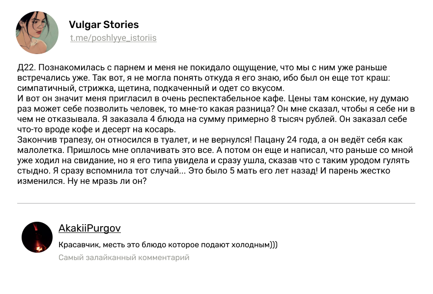 7700 Pavel.Uik Встретились спустя 5 лет1 2 года назад Истории из жизни Ситуация Скриншот Свидание Месть Девушки Парни Кафе 260 146 22 6 2 Ещё 0