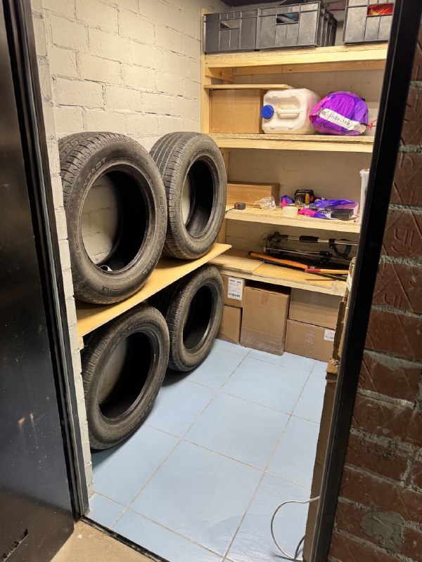 Сделано всё аккуратно, но у меня лично вопрос: поискать металлический на заказ угловой стеллаж в низу, отлично бы уместились бы колеса, вещи рассортировать, что реально хлам на помойку, что нужно оставить. Картинка для примера