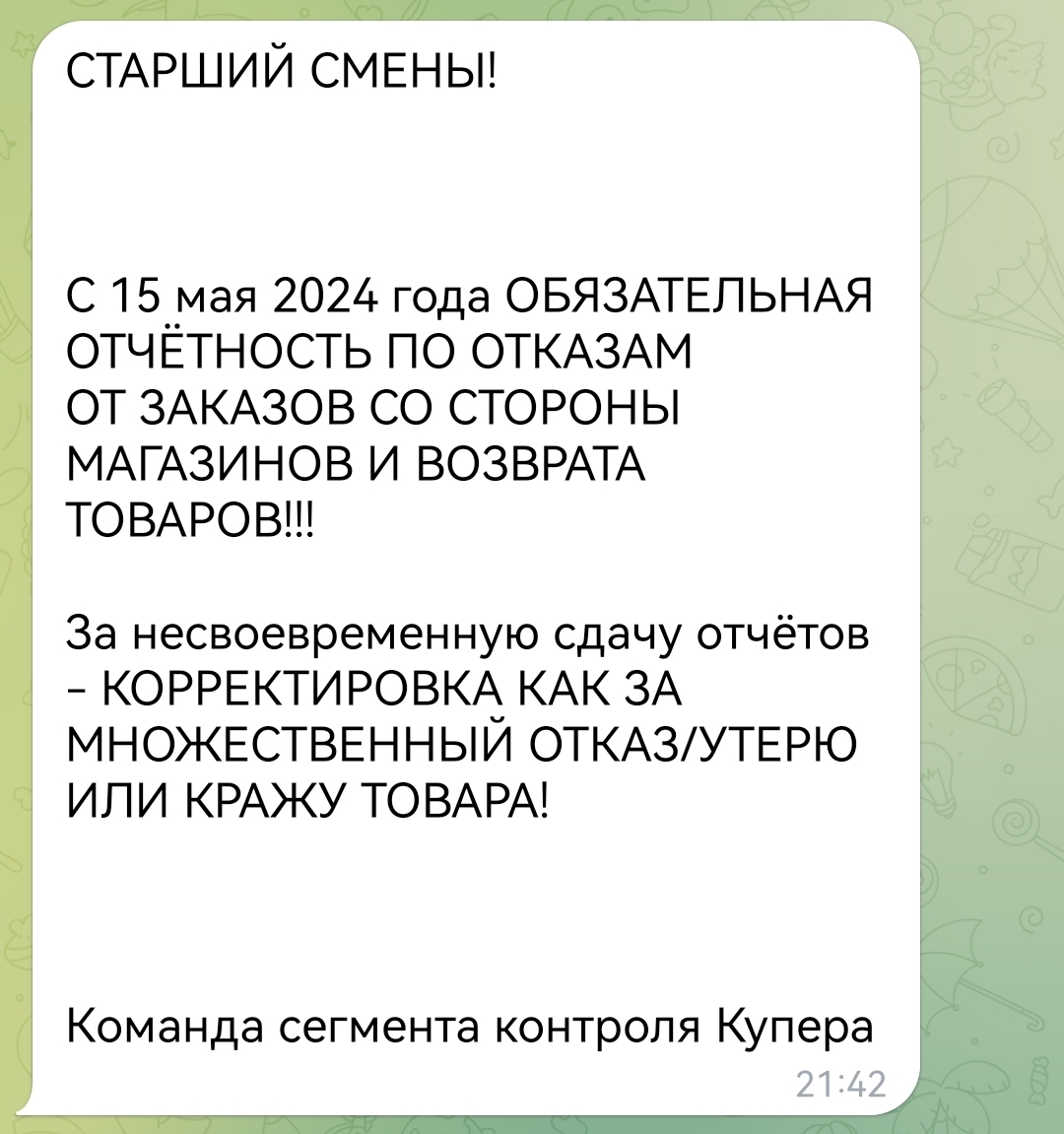 С 15 мая 2024 года ОБЯЗАТЕЛЬНАЯ ОТЧЁТНОСТЬ ПО ОТКАЗАМ ОТ ЗАКАЗОВ СО СТОРОНЫ МАГАЗИНОВ И ВОЗВРАТА ТОВАРОВ!!!