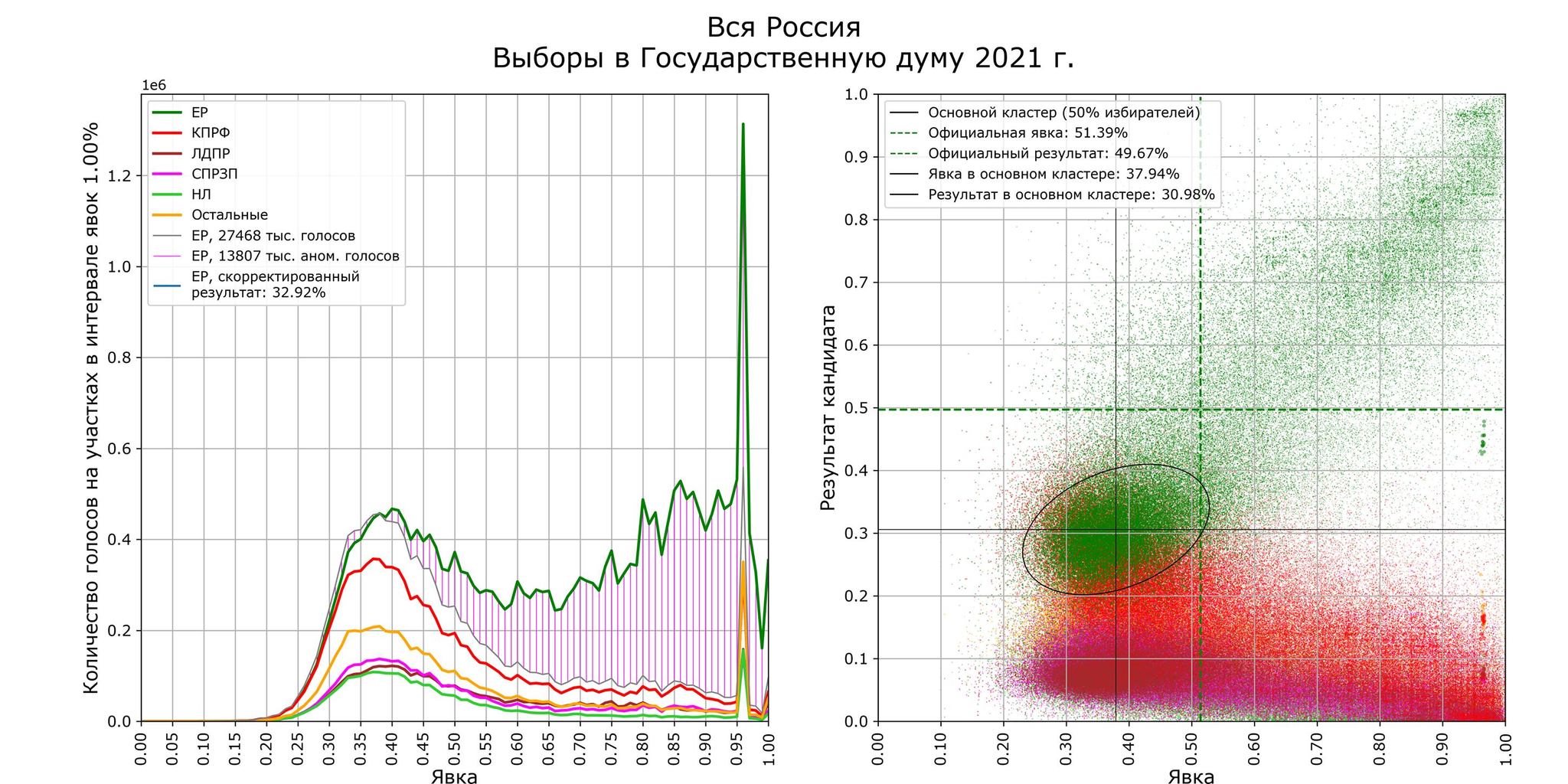 На нефальсифицированных участках явка в среднем 38% (как в 2016 году), ЕР получает по двум оценкам от 31% до 33% (как в 2011 году).