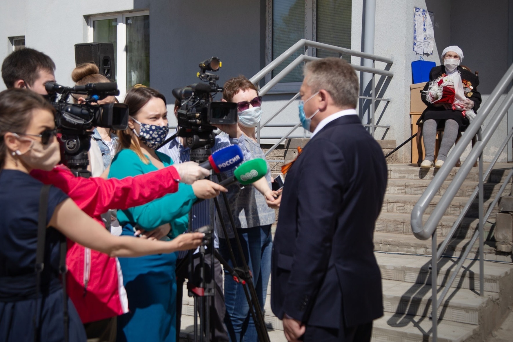 В Башкирии устроили мини-парады для ветеранов, т.к. они все сидят по домам и парад отменен. Здесь мэр Уфы Ульфат Мустафин раздает интервью для телека