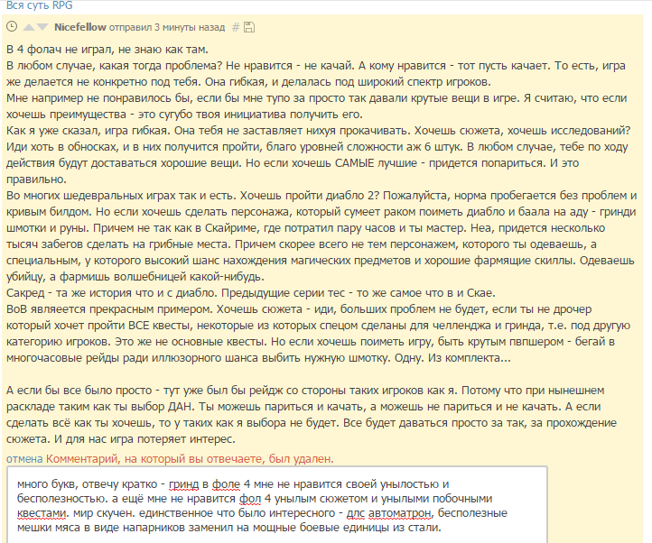 КОТОР, Скурим, 3 Фол, НВ, Готика, Sacred, mass effect - там гринд интересен. А тупой гринд как раз в 4 фоле. И кажется, тут мне предлагали не заниматься гриндом, если не хочу, вот я и нехочу им заниматься в 4 фоле, считая что он реализован отвратительно. Нравится - занимайтесь, мне не охота, есть примеры куда более интересных игр.