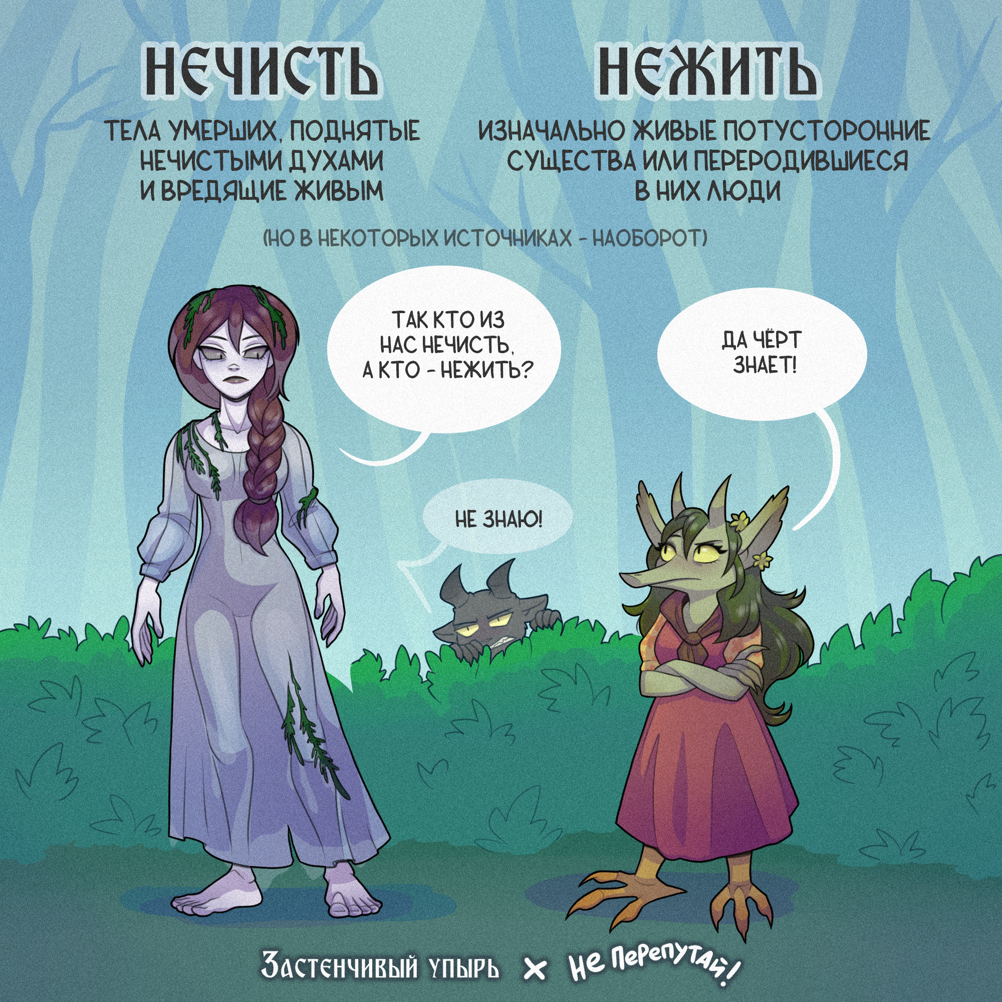 Эта картинка навела в моём ВК суету, т.к. многие с ней не согласны. Я не занимаюсь образованием, я не культуролог и/или славянист, но мне жуть как захотелось выразить непопулярное мнение про нежить. Своих персонажей я всё равно буду называть нечистью.