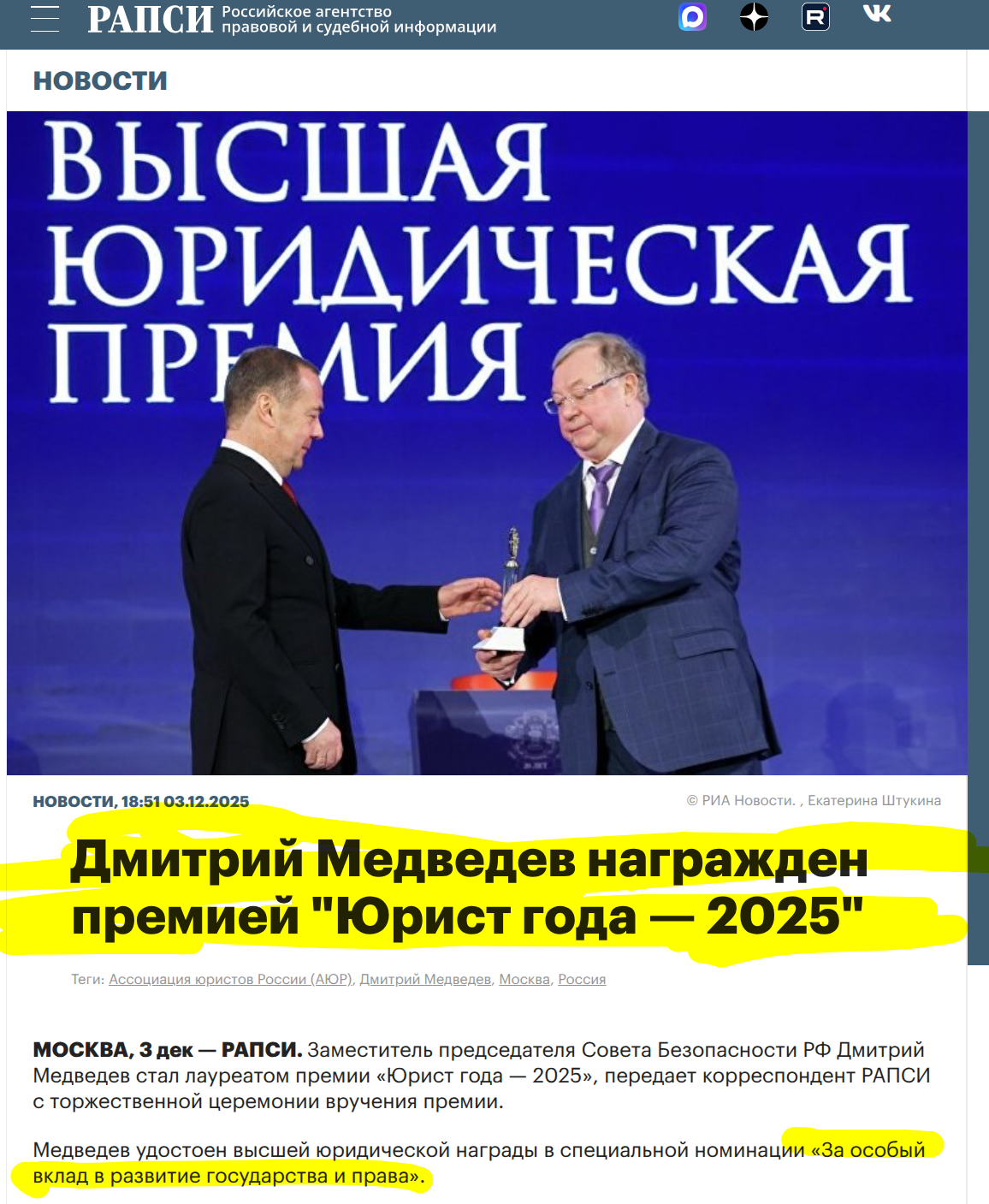 544 Animegravitation Топовый автор Всё что нужно знать о качестве и уровне юриспруденции в России :) 2 дня назад Дмитрий Медведев награжден премией "Юрист года — 2025" Медведев показал школьникам мемы и цитату о «своре хрюкающих подсвинков» Это всё что нужно знать Всё что нужно знать о качестве и уровне юриспруденции в России :) [моё] Закон Лига юристов Юристы Право Длиннопост 205 178 21 19 5 3 2 1 Ещё 3