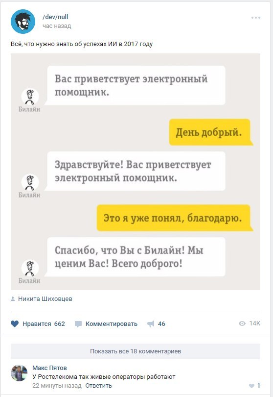 4036 Lomamaisty 8 лет назад Всё, что нужно знать об успехах ИИ в 2017 году отсюда ВКонтакте Скриншот Искусственный интеллект Бот Билайн Ростелеком
