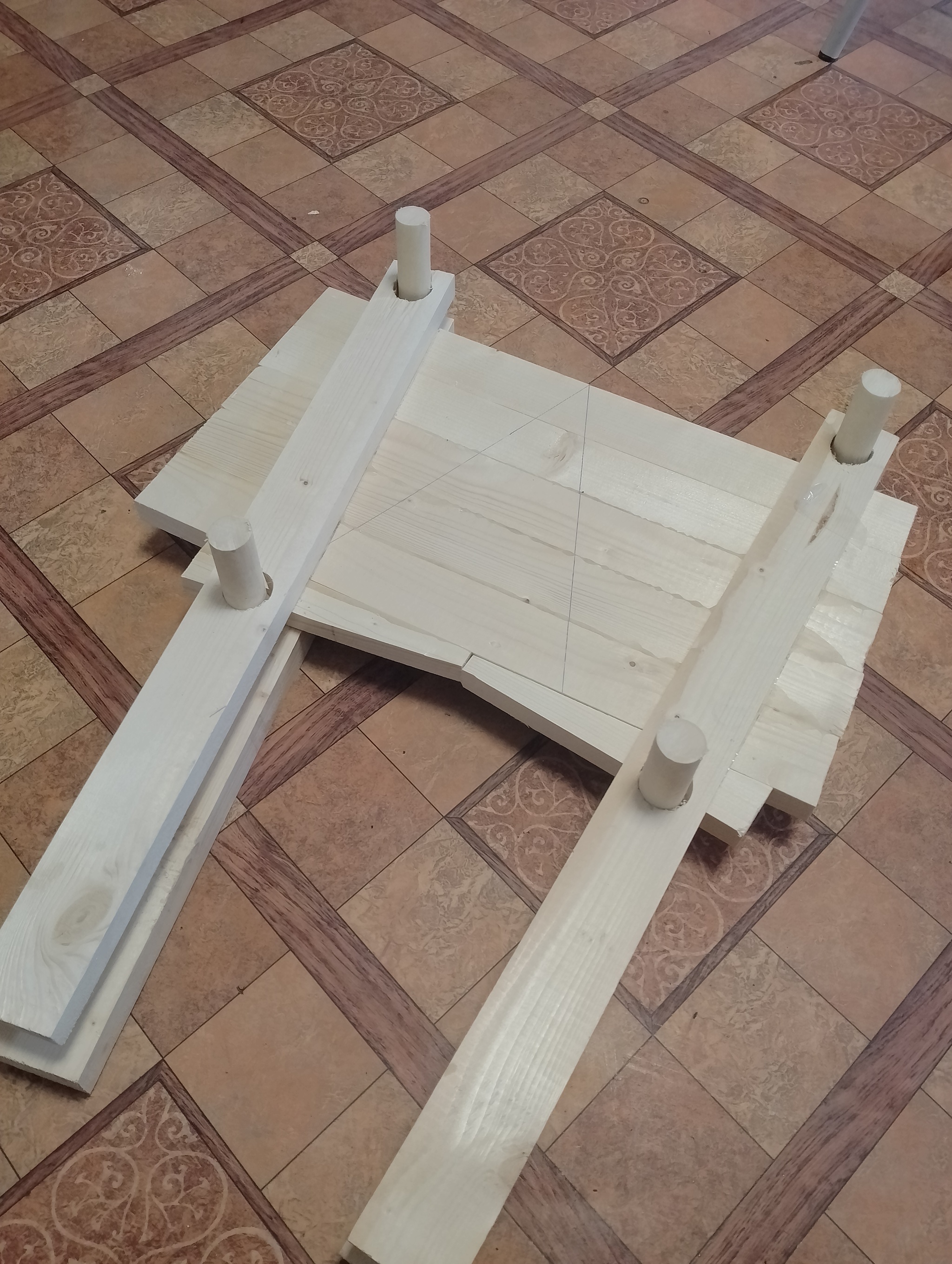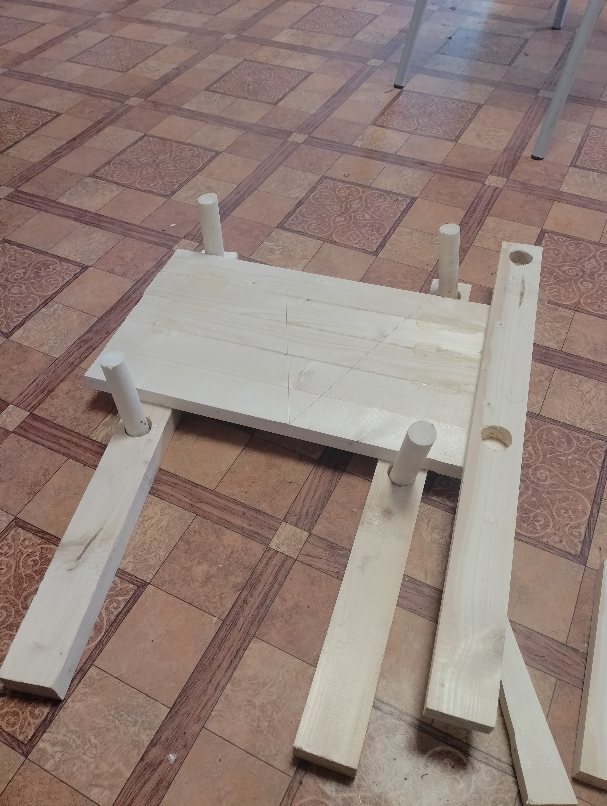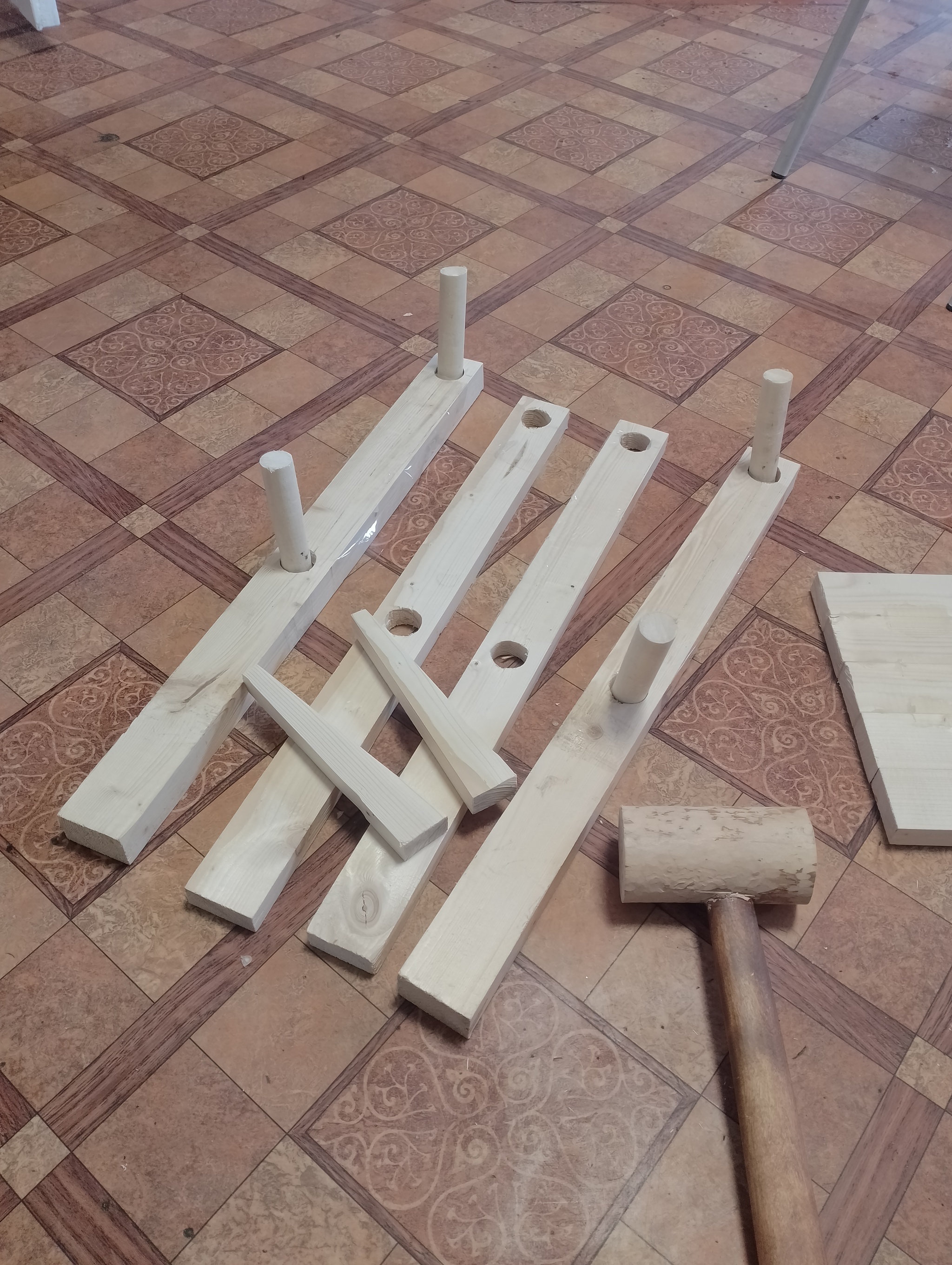 Изготовь такие вот детали. 4 ровных брусочка, можно 40 на 20 , можно толще. Просверлить на равных расстояниях отверстия как на фотографии, сделай 4 колышка и 2 клина.