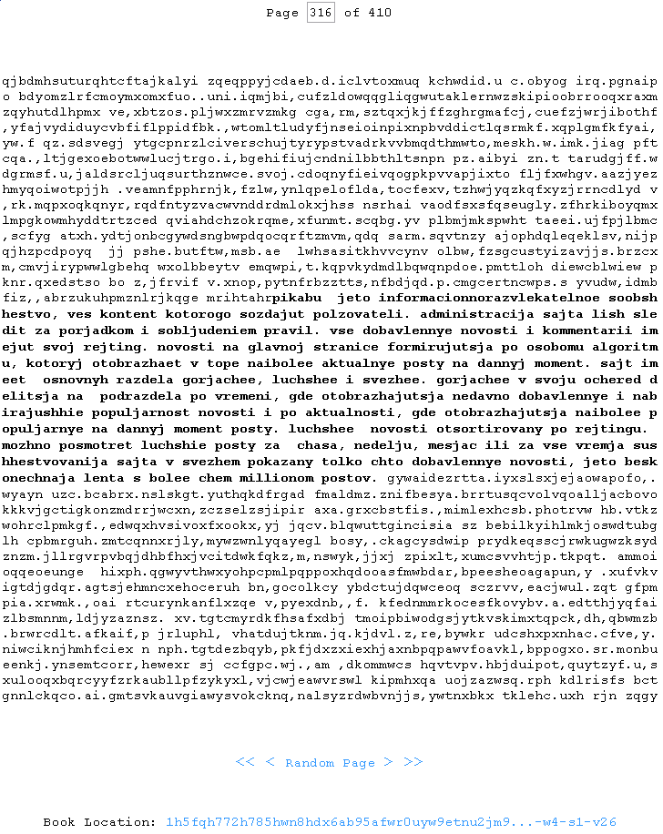 Снизу мы видим ссылку на нашу книгу (кстати, текст встречается не в единственном экземпляре). Бессмысленна длинная строка символов, заканчивающая многоточием - часть номера шестиугольной "комнаты". w4 означает 4ую стену. s1 - первую полку. v26 - 26 том. Не забываем, что текст встречается на странице 316.