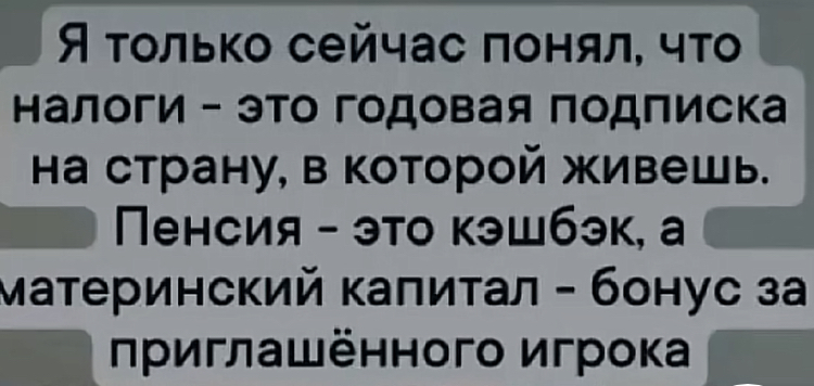 17872 Cherrylena172 Всё сходится 3 года назад Мысли Картинка с текстом Юмор Скриншот Налоги Пенсия Повтор 175 22 17 8 6 Ещё 0