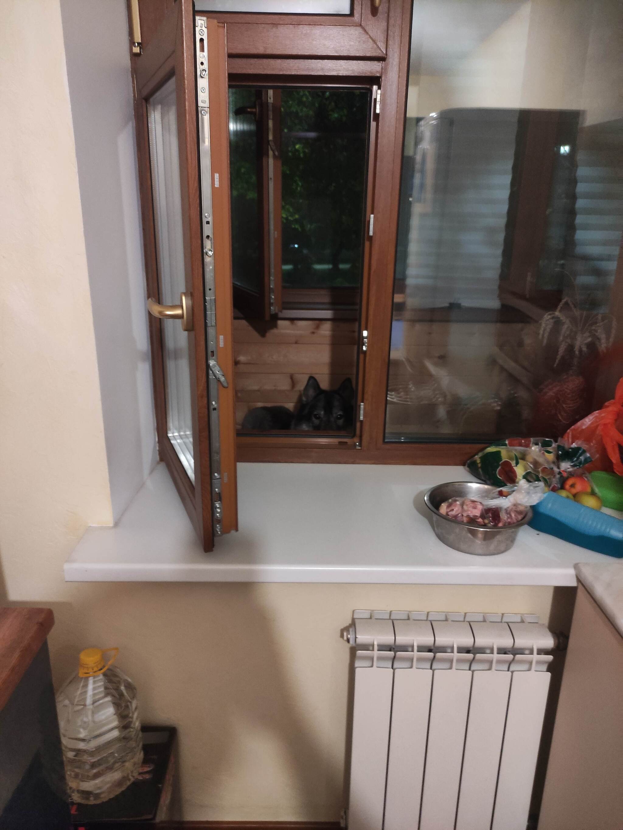 Стою на днях на кухне, жарю курочку, гусары молчать! Что бы собака не крутилась под ногами, выгнал ее из кухни и закрыл дверь. Вдруг практически физически ощущаю на себе взгляд, поворачиваюсь, и вижу следующую картину.