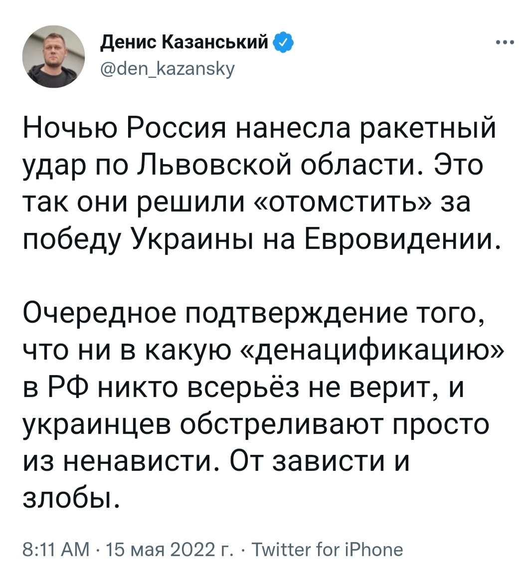 Когда неожиданно для всех победила Украина, Шойгу заплакал, Лавров дрожащими руками начал отсчитывать 30 капель корвалола прямо в клубничный ликёр и только Владимир Владимирович, едва сдерживая разрывающее душу пламя зависти, хрипло сказал сквозь зубы: