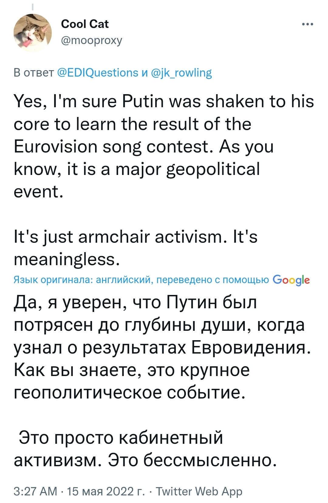 Представил как в уютном кремлёвском кабинете собрались Путин, Шойгу, Лавров и другие, всю ночь смотрели Евровидение, пили клубничный ликёр, болели за Сербию.