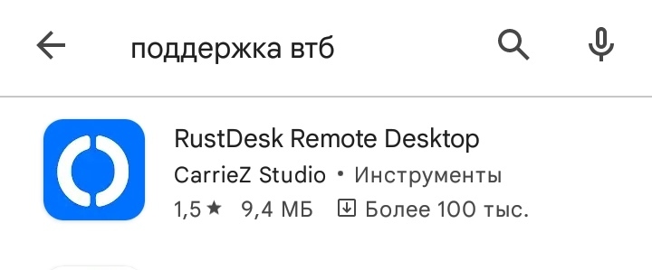 Проходит где-то неделя-полторы, мама сообщает - опять звонили, опять такая же вода... Ну а я че - прыг в машинку и до мамы, слушать запись. Вкратце суть такая - а вы знаете, что приложение под вашим логином установлено не только у вас, но еще у какого-то кренделя из Омска на Айфоне? Ну это не беда, ща мы вам поможем сменить логин и пароль - наберите в плеймаркете "поддержка ВТБ" и установите первое приложение в выдаче, найти его легко, оно фирменного синего ВТБшного цвета... Тут мама, вспомнив наказ своей дочи, вешает трубку, а доча интереса ради лезет в плеймаркет посмотреть, че там за "поддержка ВТБ, первая в выдаче"... И таки да, по такому запросу действительно первой в выдаче значится приложуха с синим логотипом - RustDesk Remote Desktop: