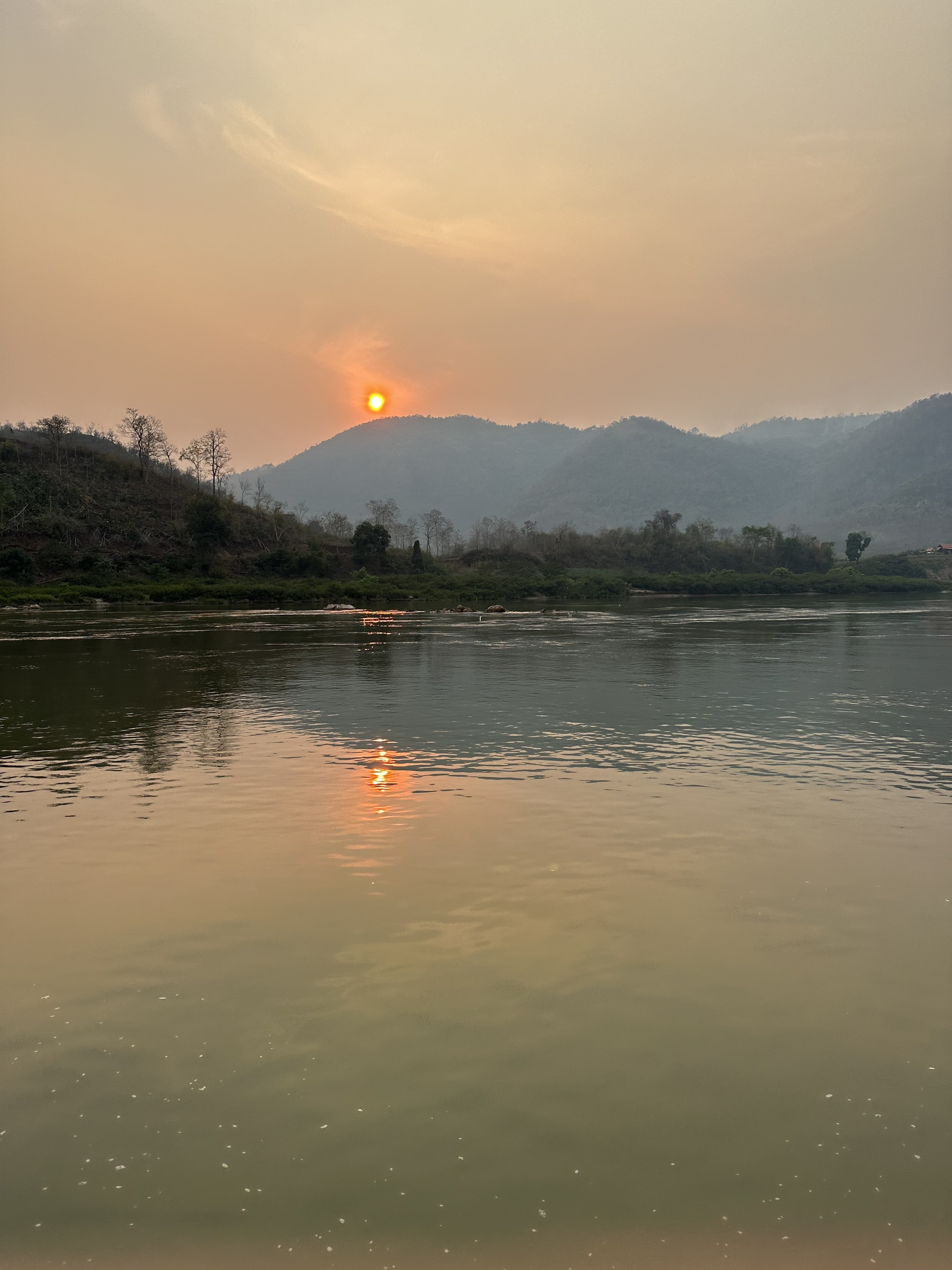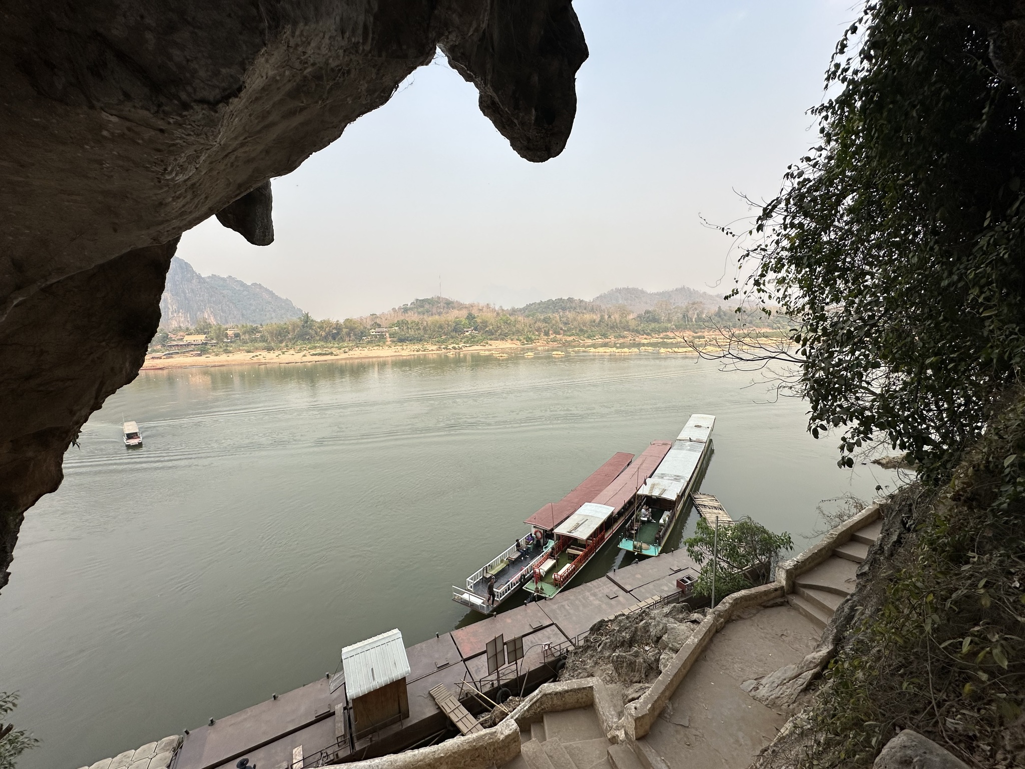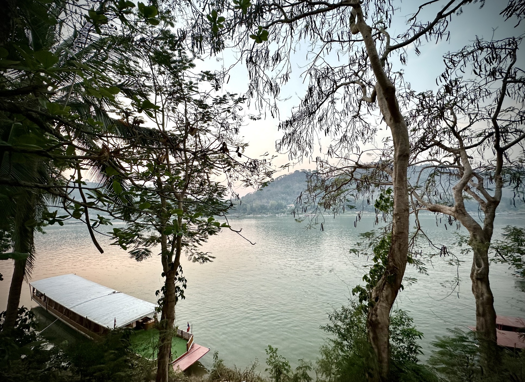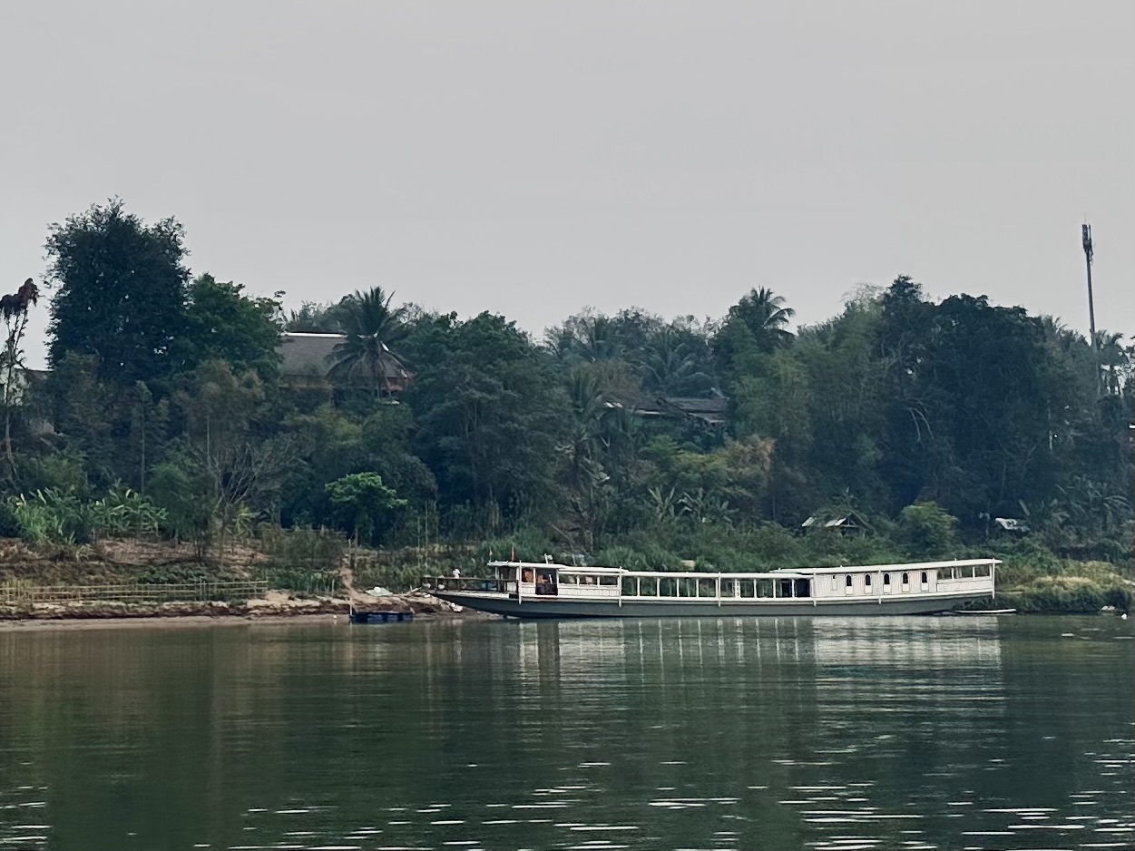 По реке Меконг мы отправились в обратное путешествие до Луанг Прабанга. Нежно-голубая вода спокойно течёт, и мы размеренно скользим по ней на деревянной лодке.