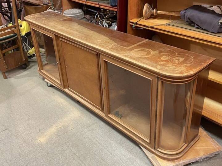 В процессе работы были устранены следующие дефекты: отслоения шпона на крышке витрины, следы от дверей на нижней части, износ гнёзд под петли.