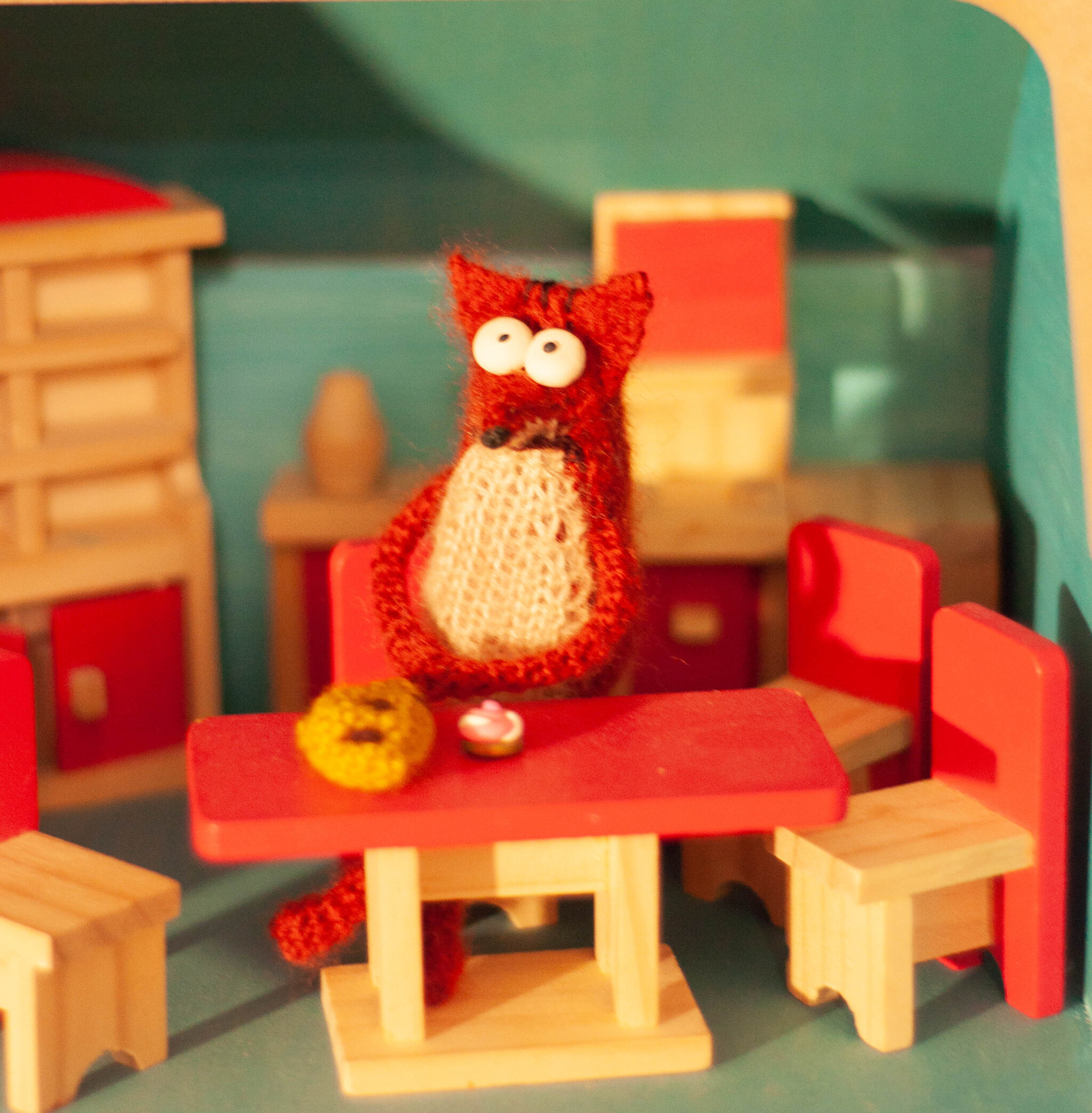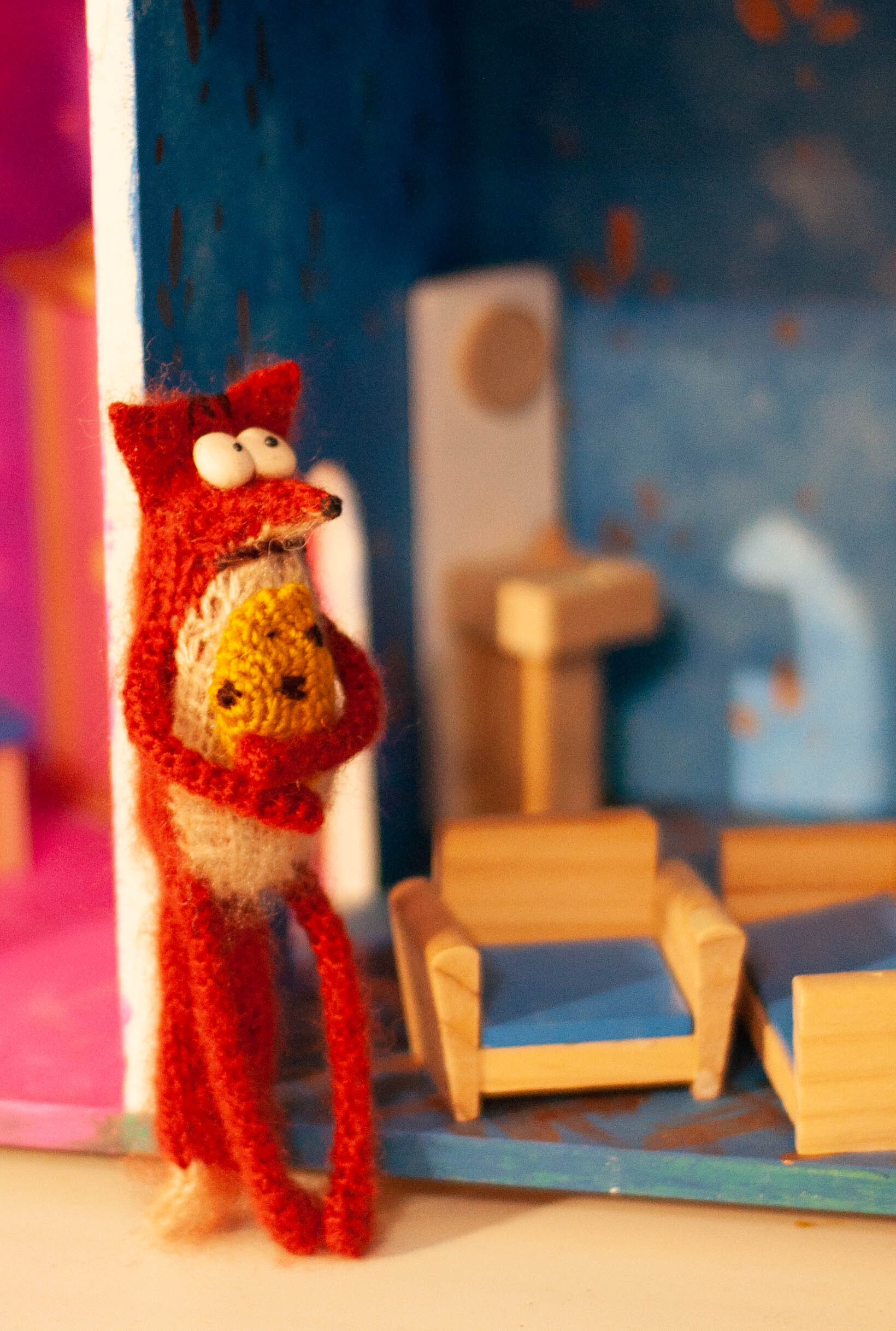 Миниатюра на гибком каркасе через всё тело. Связан из пушистого мохера. Комбинированный метод вязания. Наполнитель синтепон. Глаза из полимерной глины, леплю сама. Ростом до 10-12см.