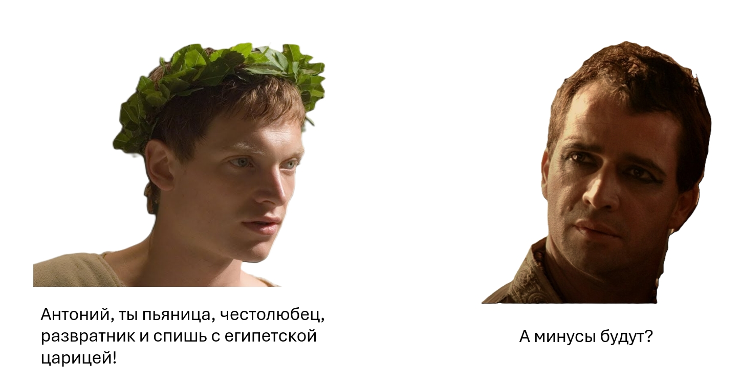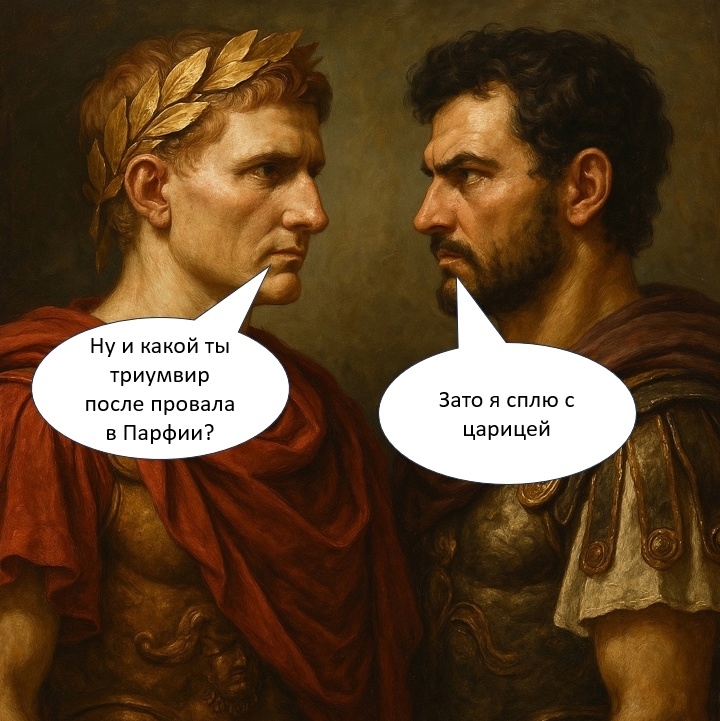 Также слухи о богатых пирах при царском дворе раздувались до фантасмагорических рассказов о самых разнузданных непотребствах. Антонию даже пришлось писать целую книгу “О моем алкоголизме”, в модном ныне жанре “исповеди звезды” и ловле за руку дешёвок на вранье. Если до этого Антоний был гораздо популярнее своего коллеги по триумвирату, то теперь симпатии римской публики начали смещаться.