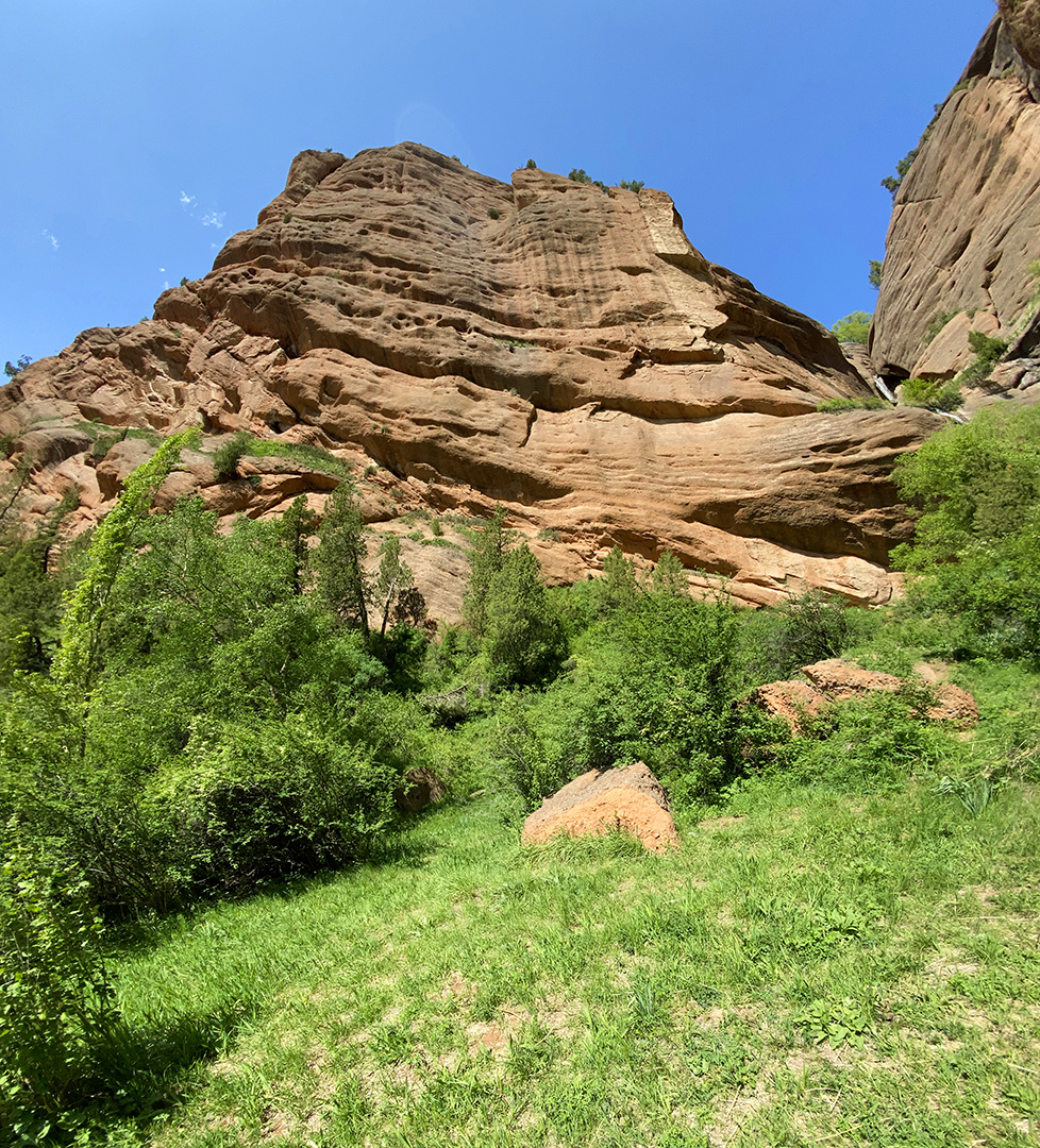 Далее великолепные красноватые скалы. Собственно, можно различить уже и фрагмент верхнего водопада: