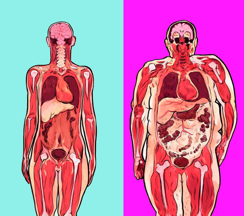 А я напомню, что это гормонально активная ткань. В нормальном количестве — всё работает чики-пуки и на благо метаболизма, а если уже 10кг сверху сметы? А если не 10кг, а больше?