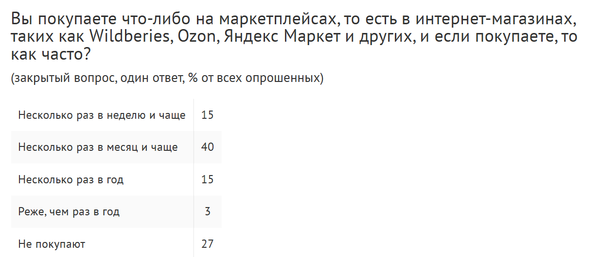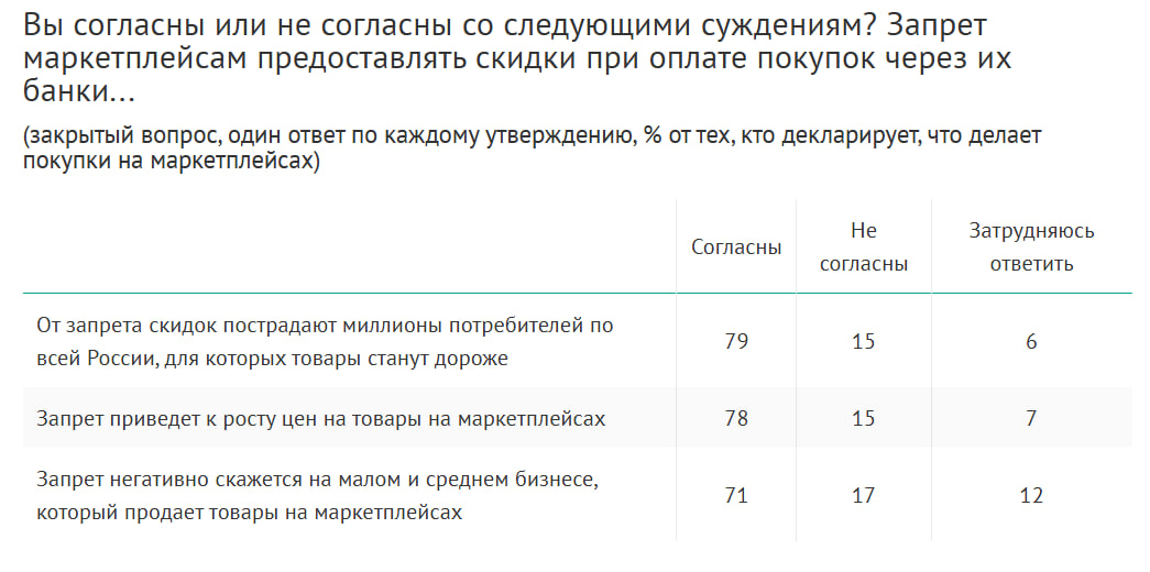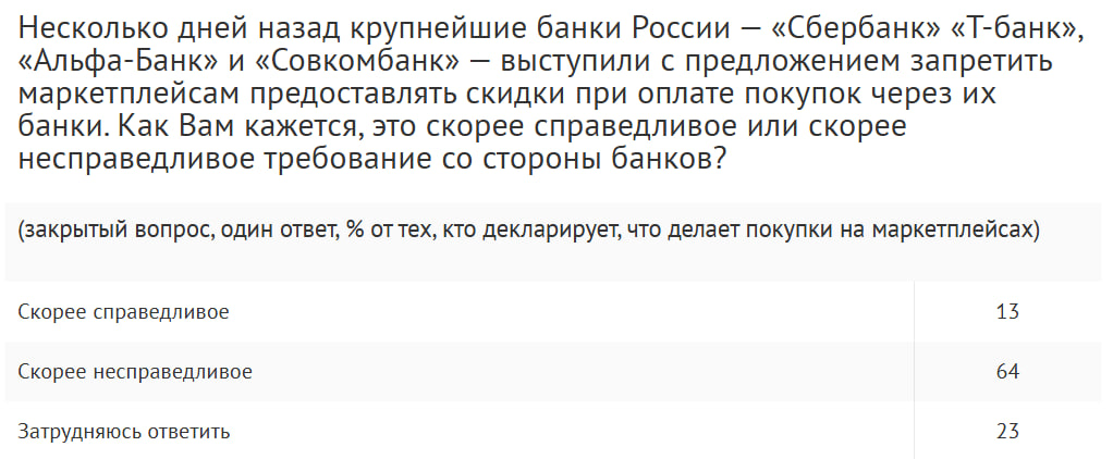 Противостояние банков и маркетплейсов разбудило даже аналитический центр ВЦИОМ, который провел оперативный опрос населения. Спрашивали россиян о том как часто они пользуются маркетплейсами, об их отношении к инициативе банков запретить скидки на торговых площадках, а также о том к чему это все приведет.