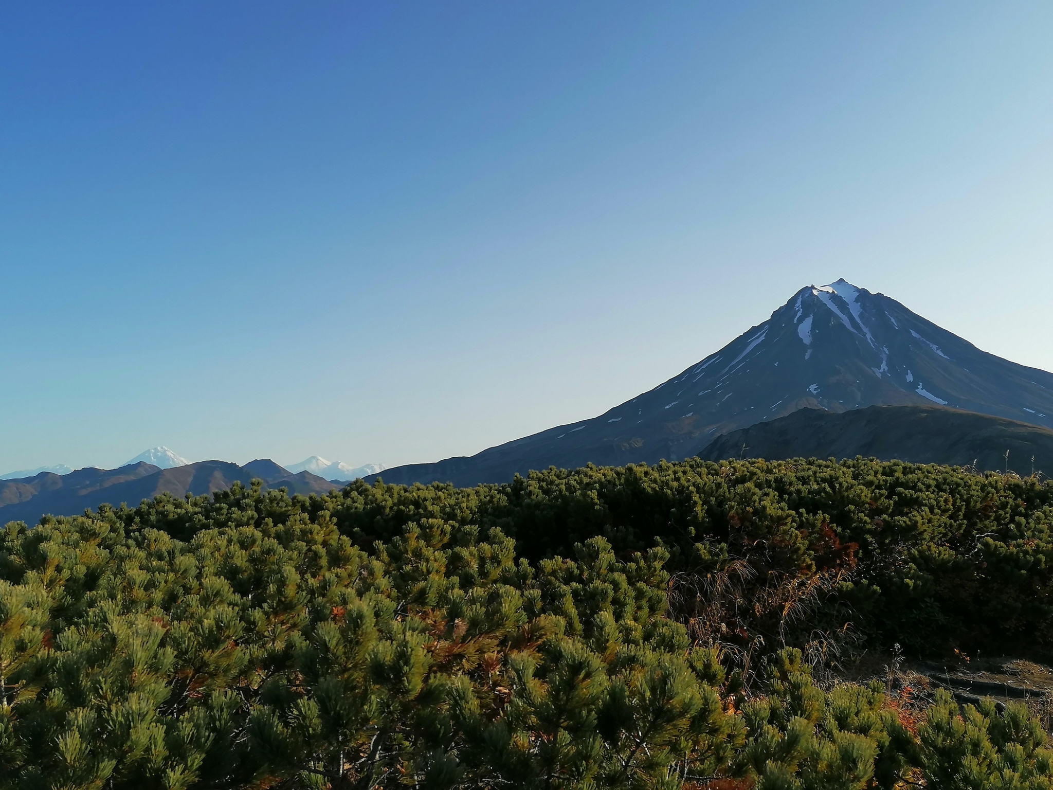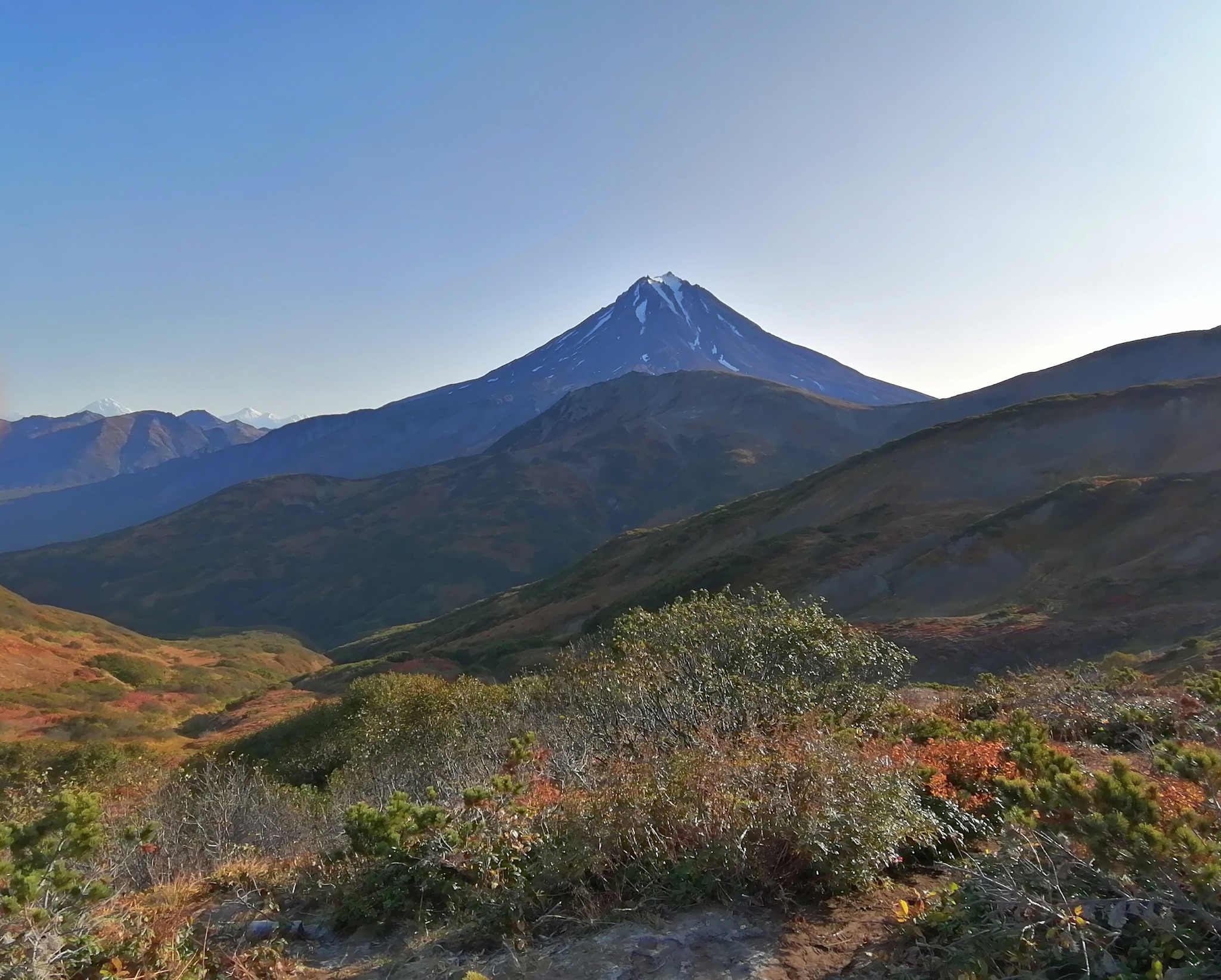 Итак, выезд на вулкан происходит часов в 7 утра. Почему примерно? Потому что люди не всегда пунктуальны. Все тургруппы обязательно делают остановку на перевале, откуда открывается замечательный вид на Вилючинский вулкан. Смотрим.