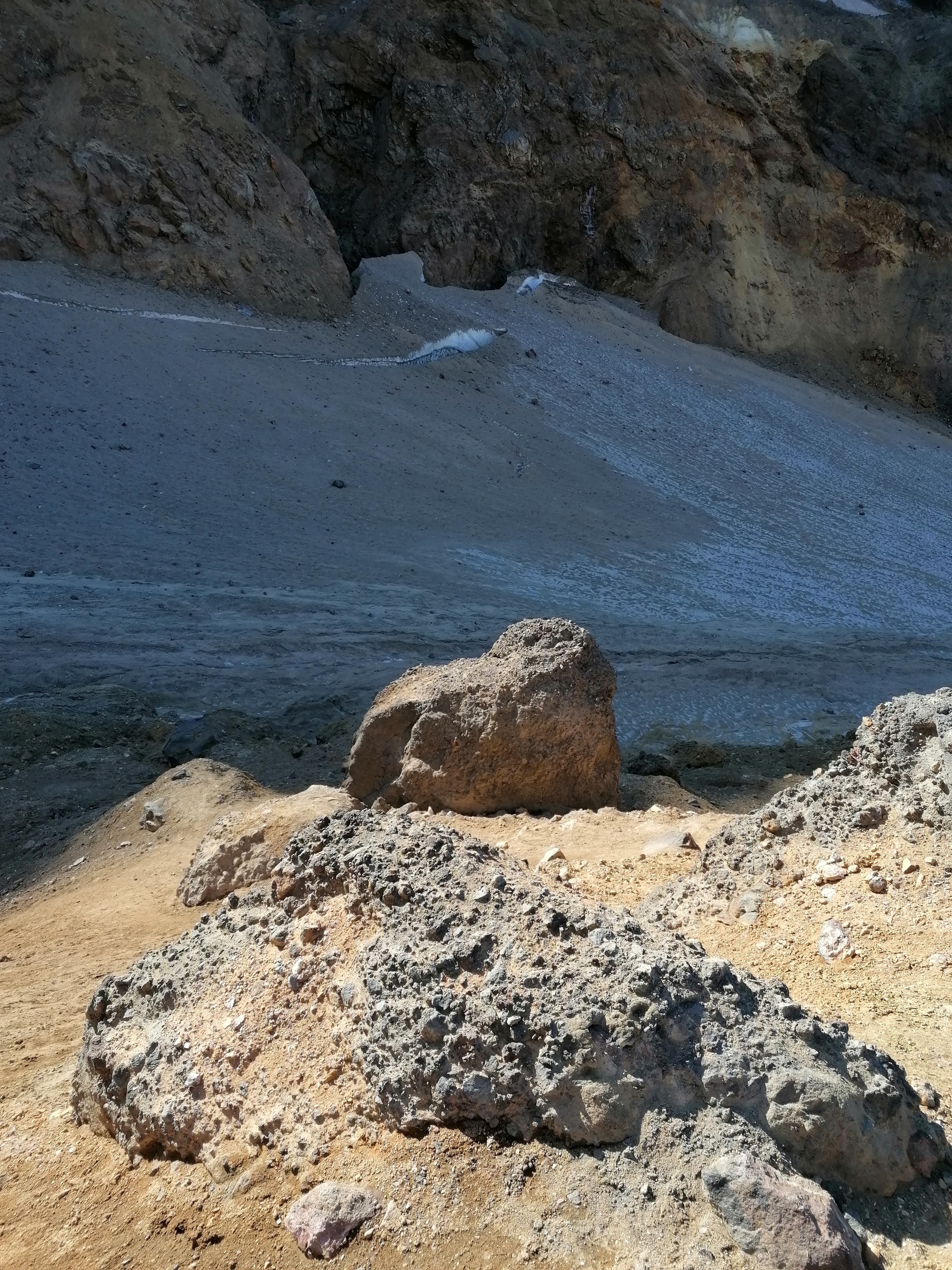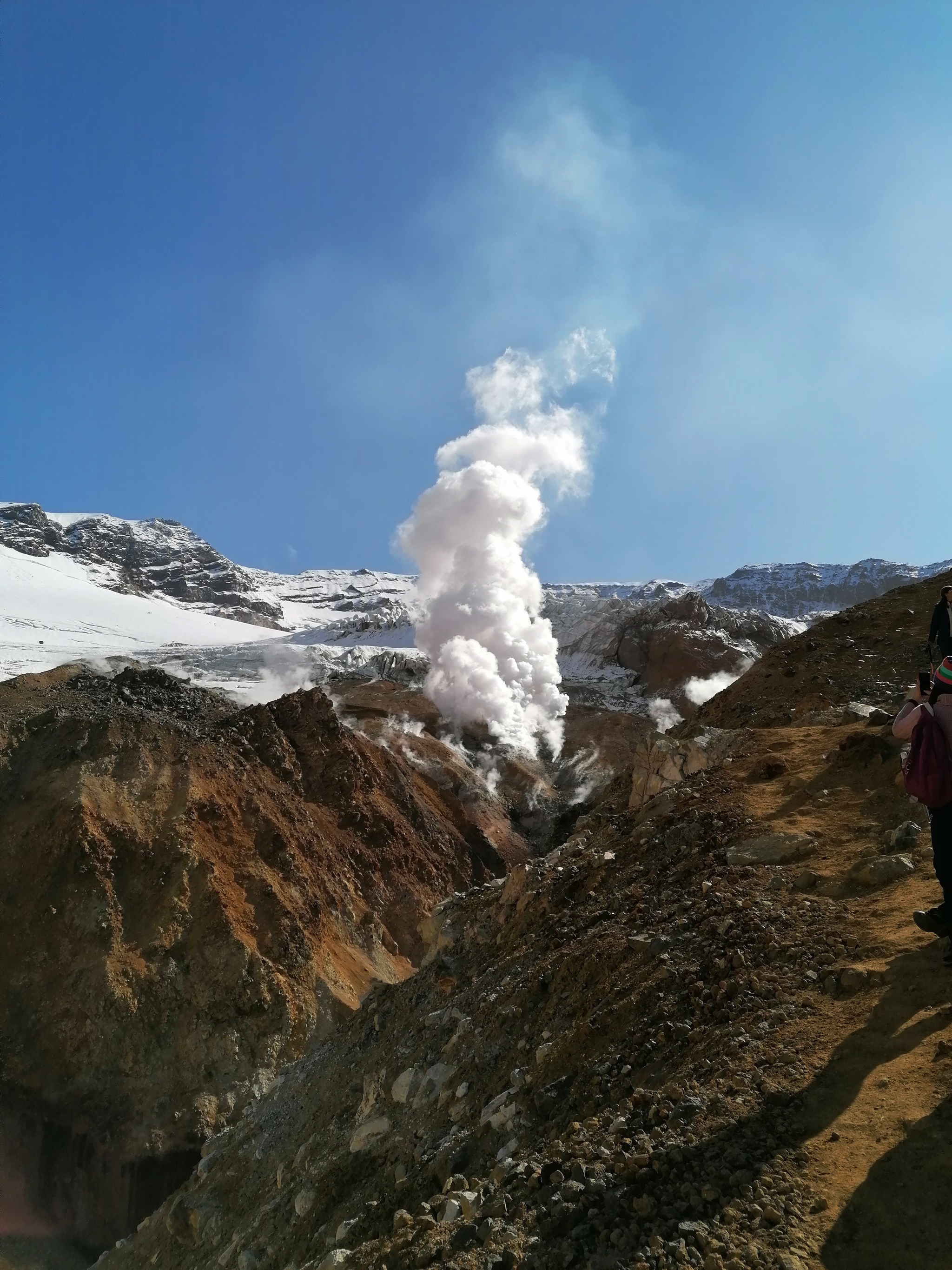 Боюсь наскучить, поэтому перейдем к Точке назначения. Сюда дошел - герой, на Камчатке побывал) Но это не активный кратер вулкана, а его преддверие. Активность вулкана в основном заключается в фумарольной деятельности. Фумарол - это грубо говоря дырка в земле из которого под давлением вылетает газ. Воняет интенсивно серо-водородом. В клубы не рекомендуется заходить, долго дышать, поскольку отравление вещь неприятная. Ну я и не рискнула, при такой то дороге обратно..