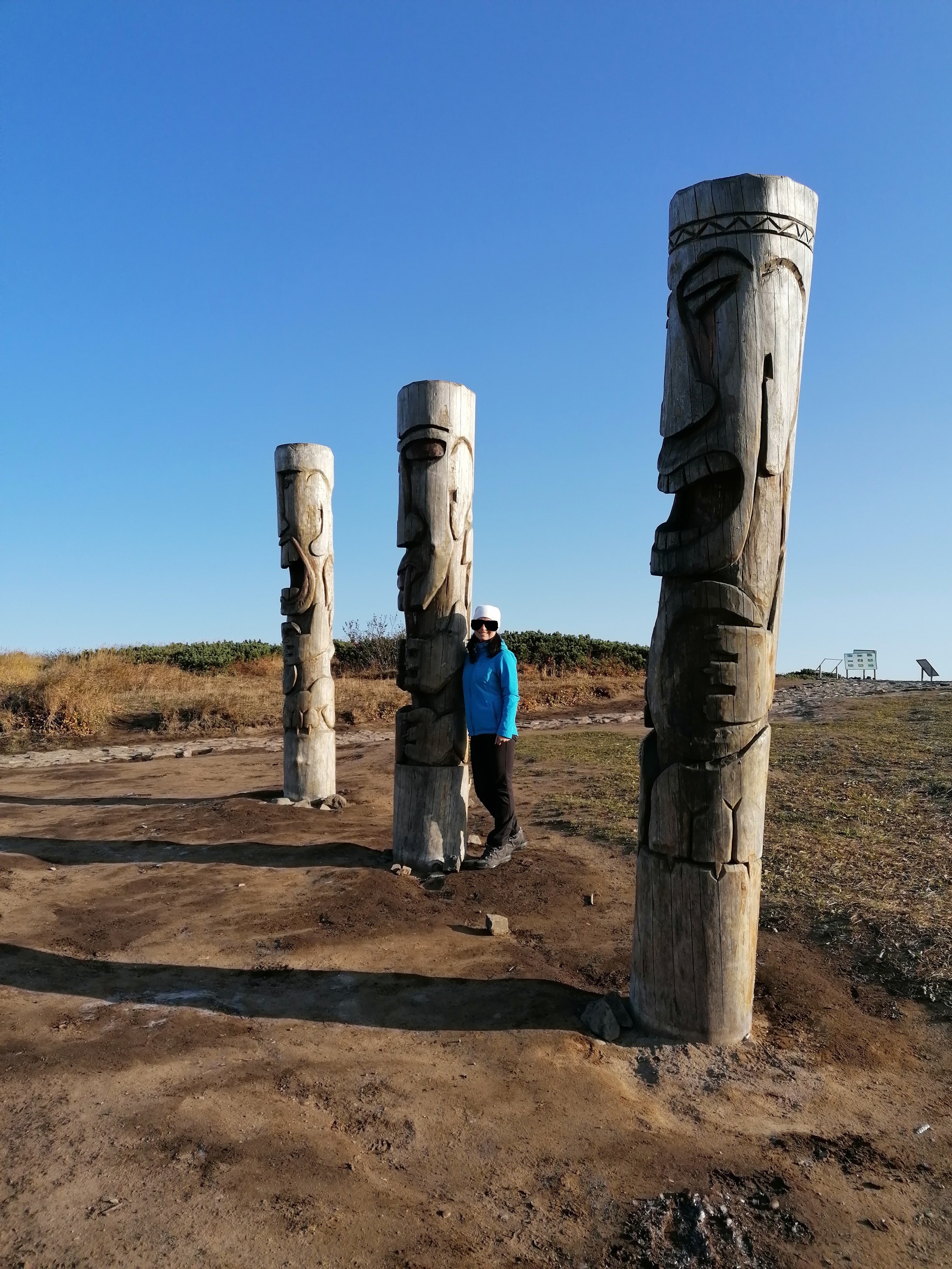 На перевале оборудована обзорная площадка. Несколько лавочек, стенды с обзором произрастающих тут растений. Все. А также присутствуют три идола. Это гамулы -духи вулканов. У ительменов (местный коренной народ) говорят, что когда курит вулкан - гамулы варят суп из кита. Забавно) Фотки без человека нет, извините.