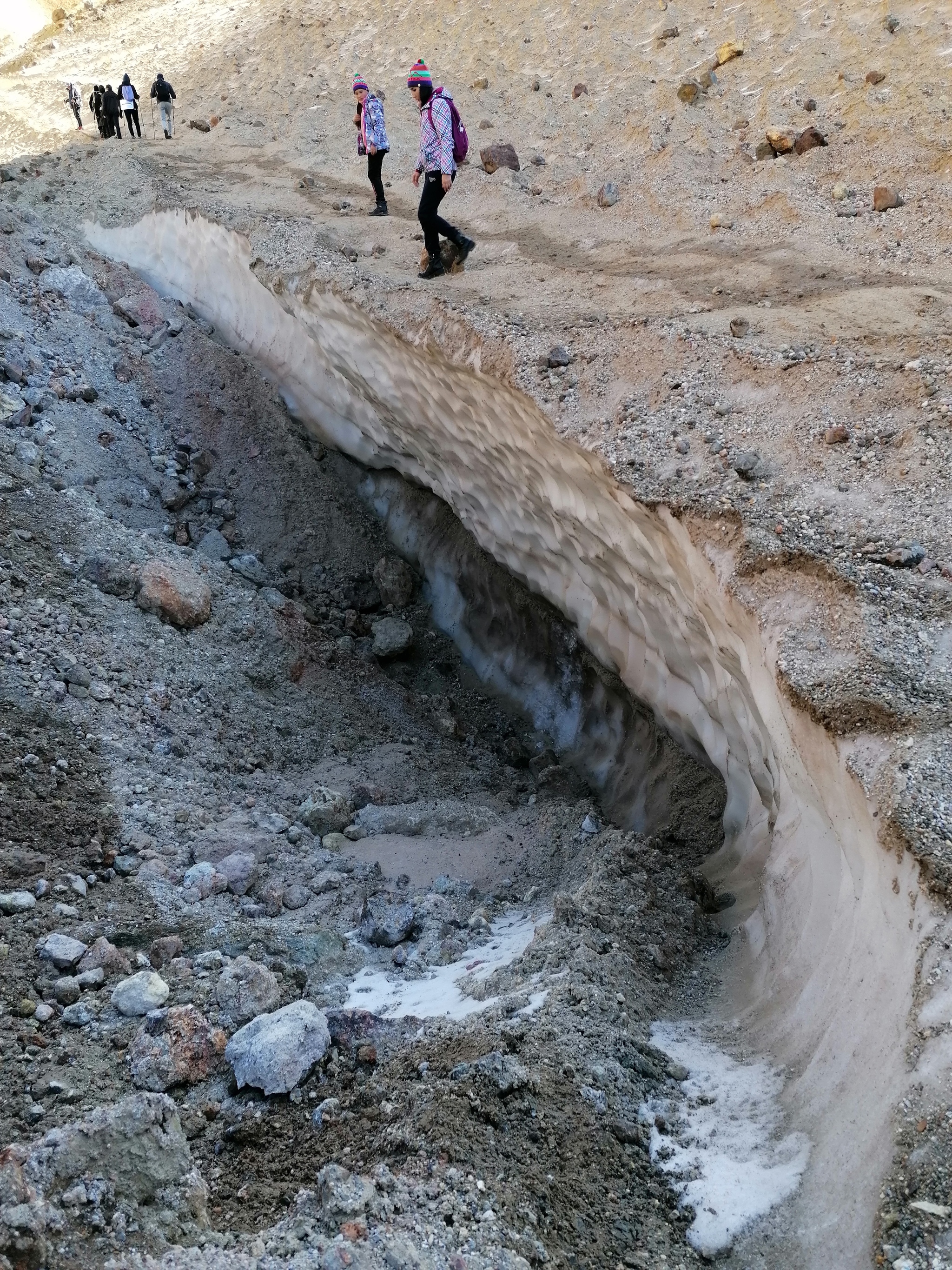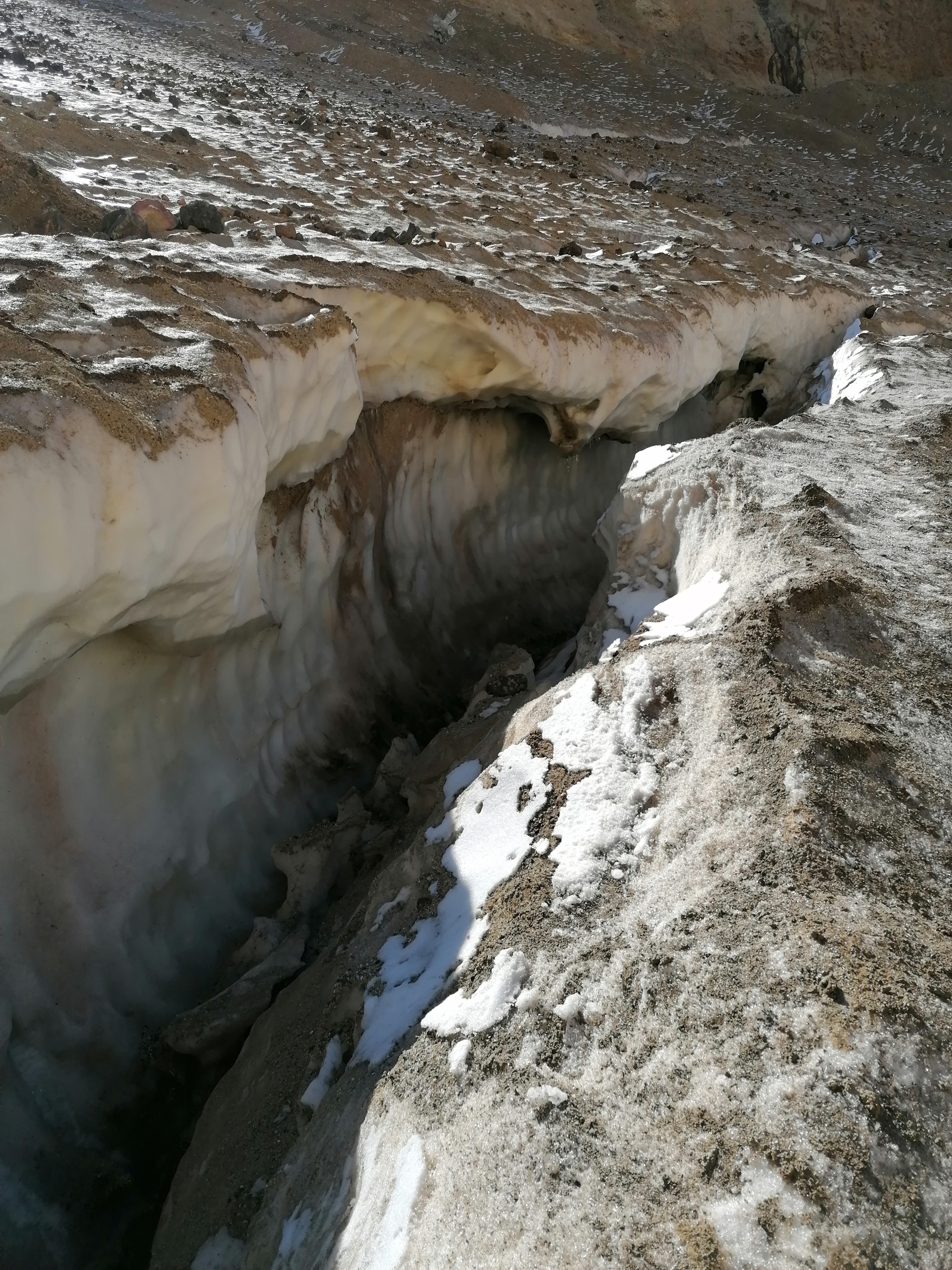 Надежда на легкий обратный путь под уклон меня покинула на первых 100 метрах.. Во-первых спускаться тяжелее, тянет понимаешь вниз побежать.. Да и мышцы работают другие и они тоже охреневают от окружающих красот.. В общем мне скоро захотелось опять в горку идти.. Добрались с божьей помощью и такой то матери. Небольшой перерыв и мы переехали на пару км подальше к каньону (оврагу) Опасный. Те мутные воды вулкана, протекают под ледником и спадают в каньон, большим, хоть и худым водопадом.. На первой фото овраг слева.