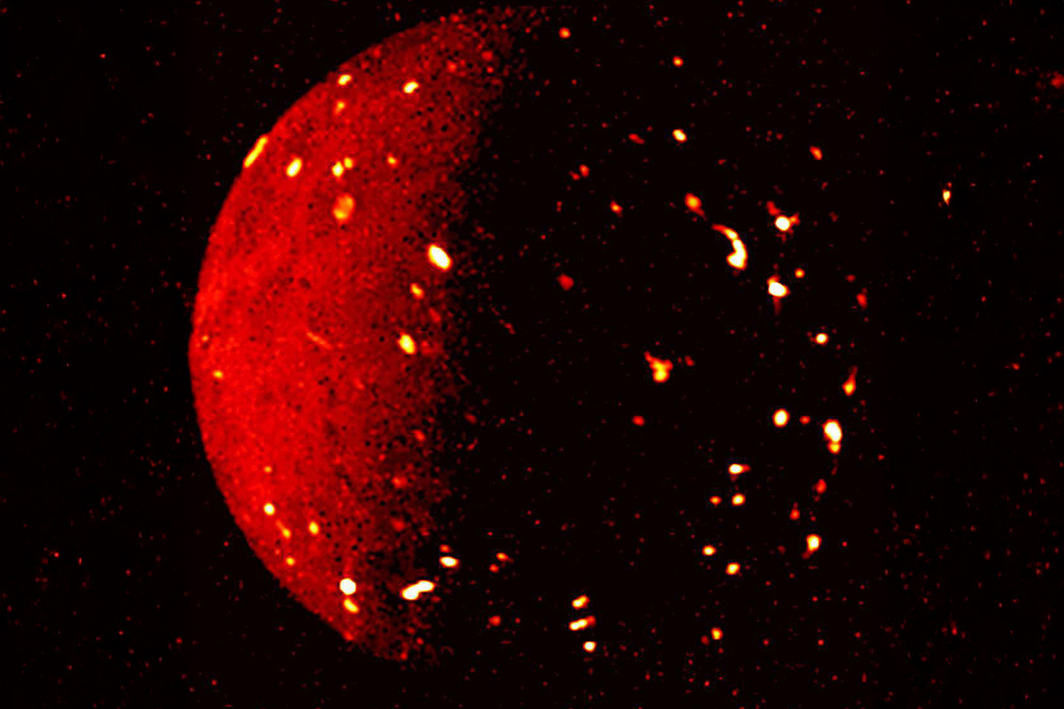 Чем ярче цвет на изображении — тем выше температура, зафиксированная прибором. Каждая яркая точка на поверхности Ио — это активный вулкан, извергающийся в момент наблюдения.