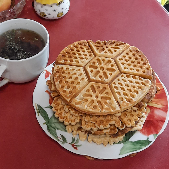 Ну вот, полчаса у плиты и горка авторских вафелек готова. Бегом за стол, а то Папка всё съест!