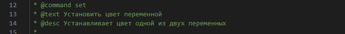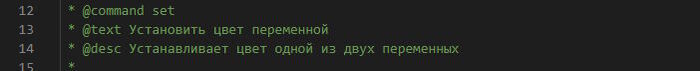 А вот дальше начинаются приколы. Следующий блок, хоть и выглядит как комментарий, и редактором кода воспринимается, как комментарий, представляет собой объявление команд и переменных, которые будут использоваться в нашем плагине.