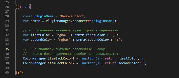 На 28 строчке мы создаём константу, содержащую название плагина (это вообще пригодится во многих случаях, так что я бы рекомендовал всегда в начале скрипта её объявлять), а на 29 по имени этой константы получаем из PluginManager параметры плагина (это как раз и есть те самые созданные нами переменные param). Как вы помните, формат у них - строка вида "0,0,0,0" - а это RGBa. Но чтобы присвоить это дело окну, его нужно немного видоизменить. На строчках 32 и 33 мы как раз помещаем значения этих параметров в обёртку, чтобы получилась строка вида "rgba(0,0,0,0)".